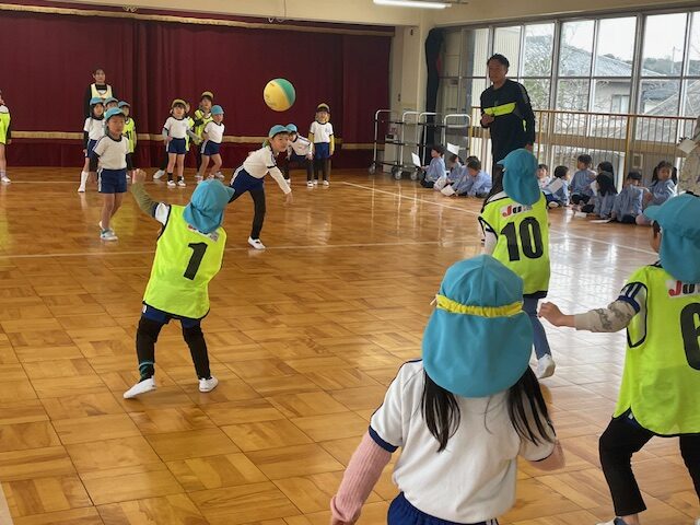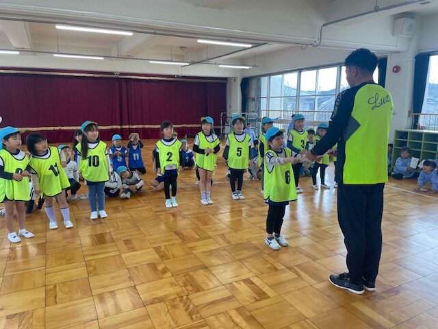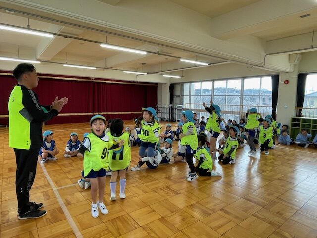 最後は、『先生にタッチする』というゲームでしたが、「ボールが飛んでいる間だけ、動いていいよ」というルールで、どの子もボールを確認しながら、楽しんでいました。