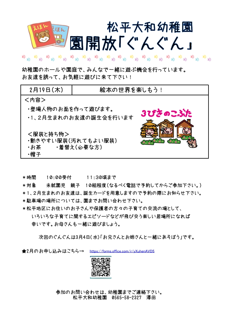 松平大和幼稚園では、早くから3歳児保育の必要性を認識して3年保育に力を入れてまいりました。又、子育て支援事業の一環として、満3歳児の受け入れや未就園児の親子を対象に園開放も行っています。幼稚園全体をファミリーと考え、学年を超えての交流も大切にしています。