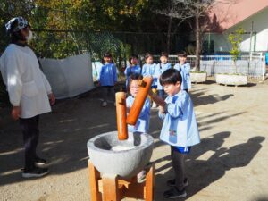 体育の先生が杵を持ち、こどもたちが大きな声で応援します。