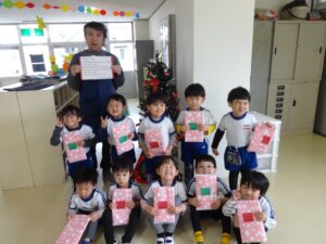 さあ、みんなでプレゼント探しです。無事に見つかり先生から一人ずつプレゼントをもらいました。