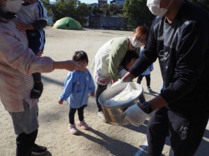 5歳児は自分たちできな粉をまぶして食べました。雑煮もきな粉餅も大人気で、たくさんおかわりをしていました。