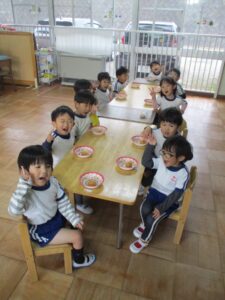 大きいみかんをみんなで分けて食べました。「おいしかった~」と聞こえてきそうな笑顔ですね。
