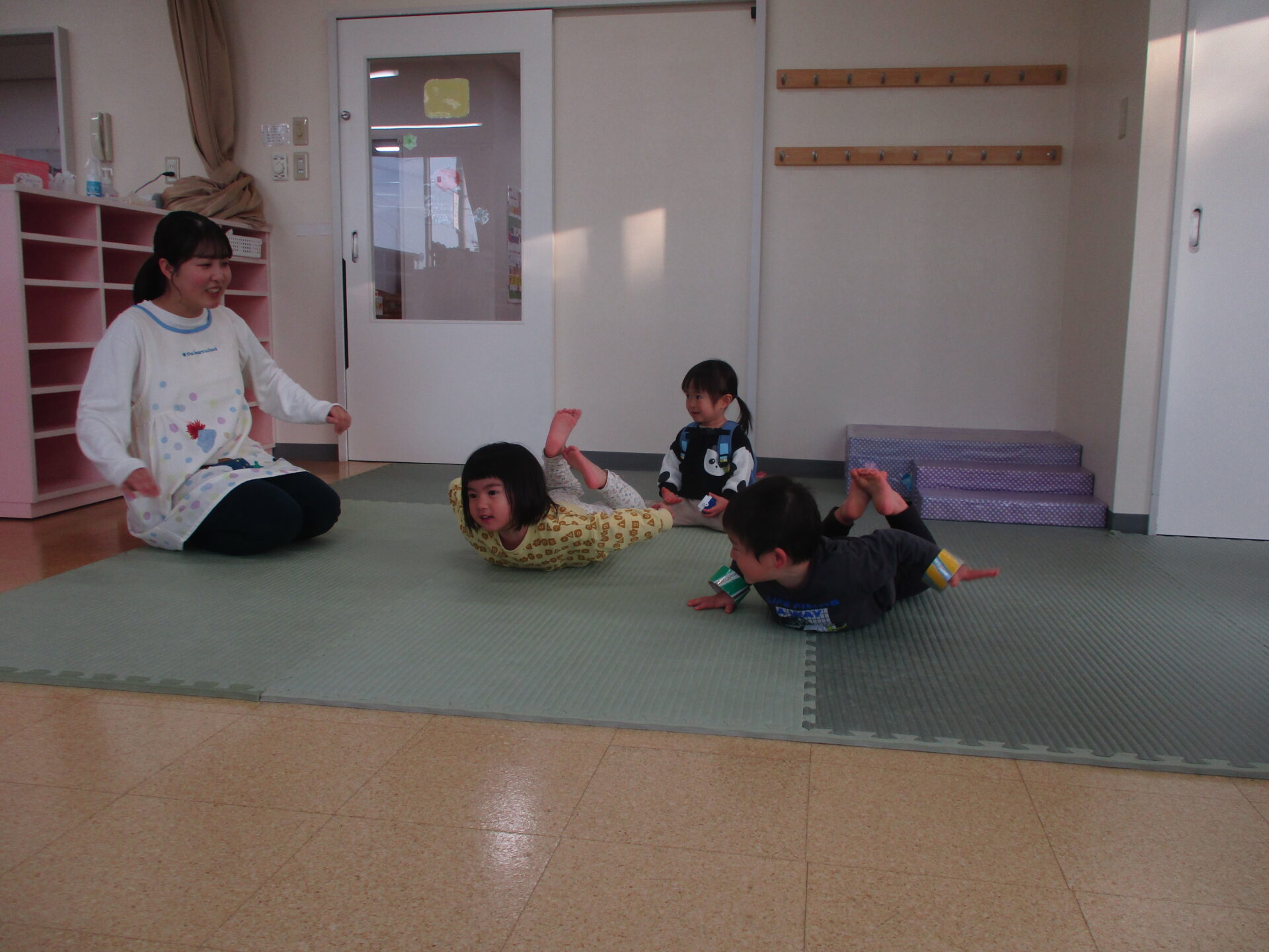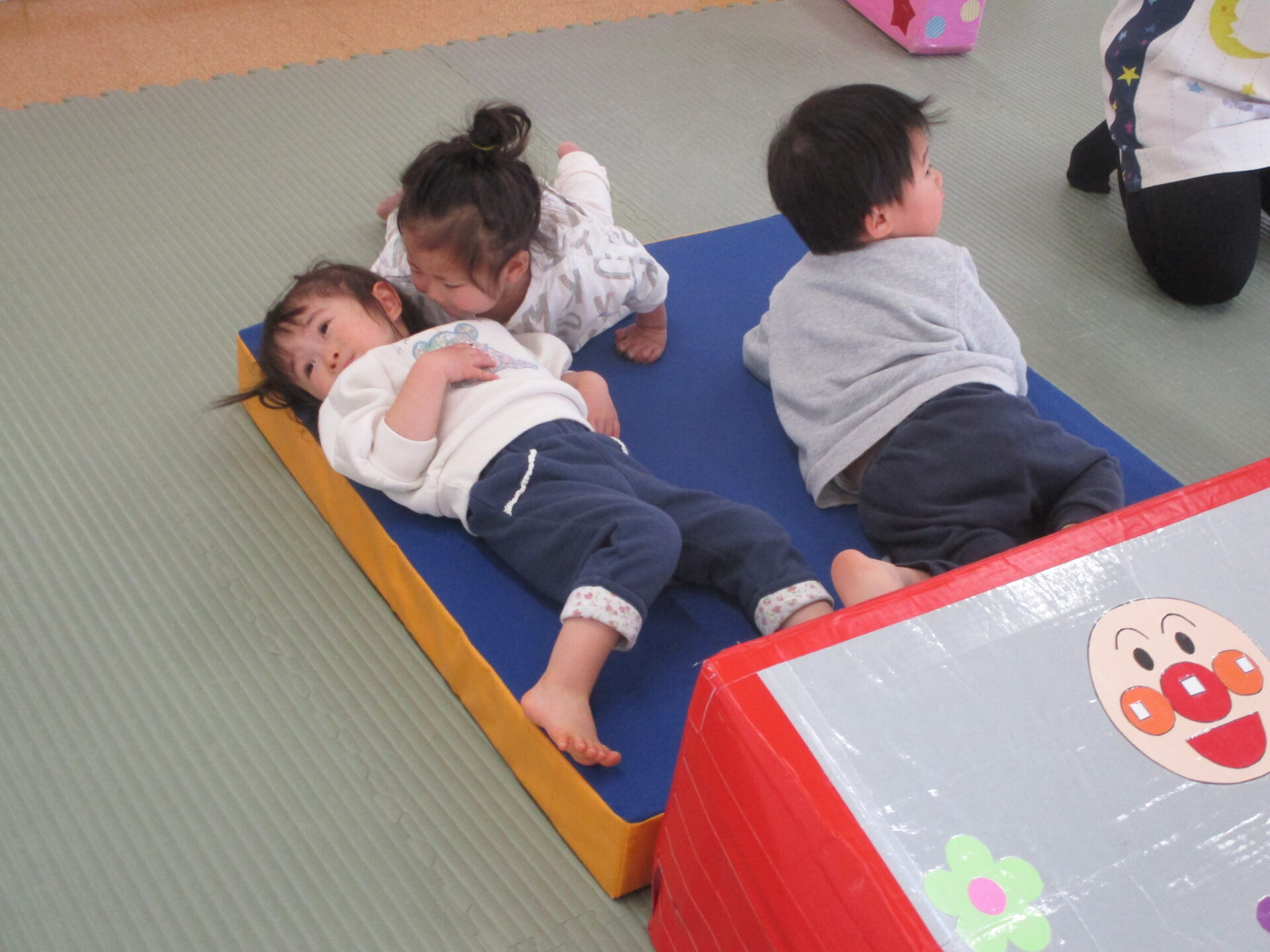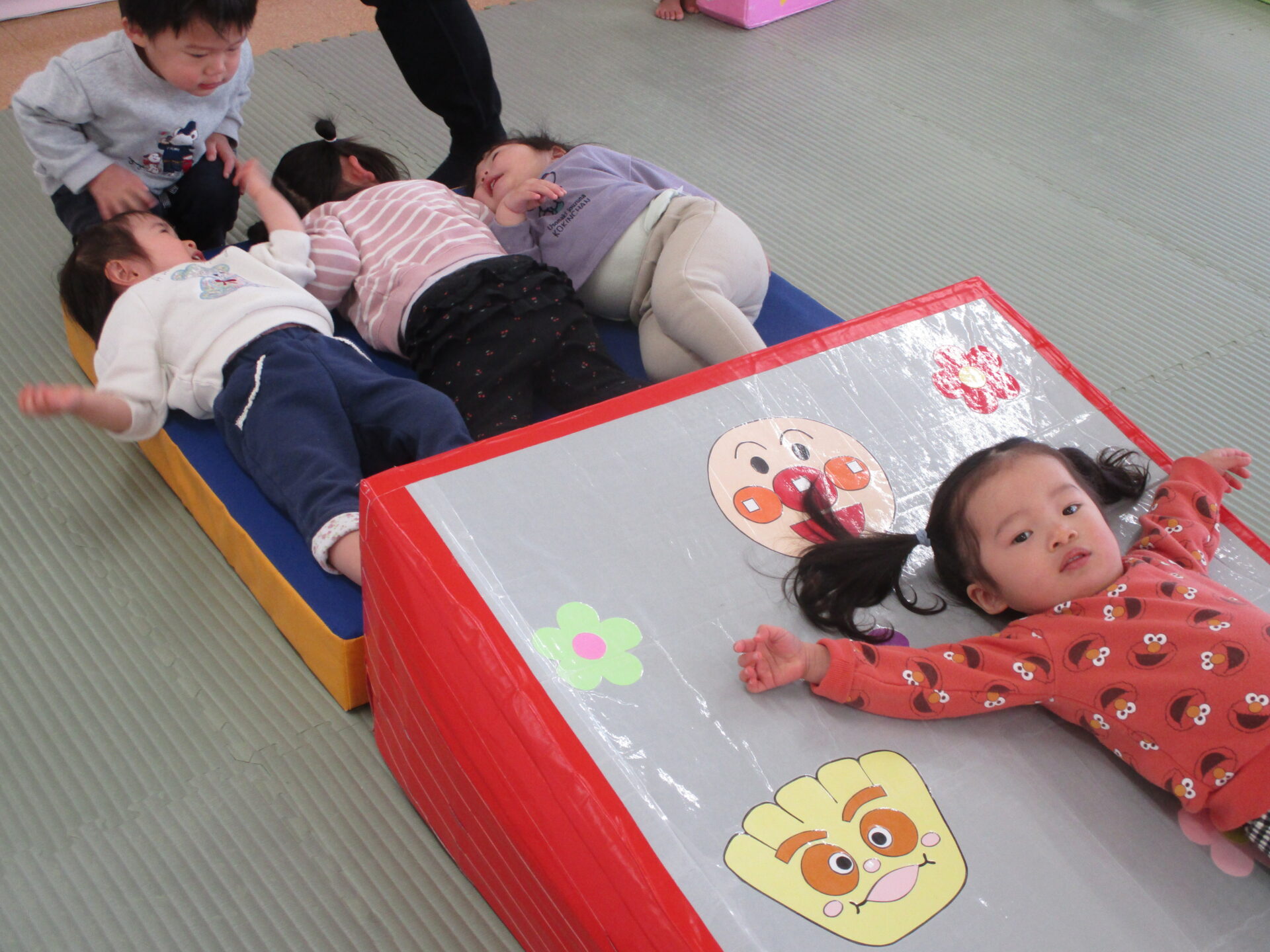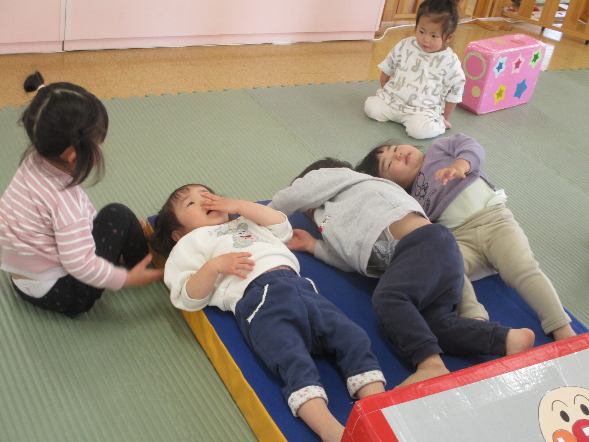 お部屋をのぞくと何だか楽しそうな声が聞こえます。みんなで輪っかの中に入ったり出たりしていると、先生が「ぼぉ〜ん・ぼぉ〜ん」と歌っています。どうやらおばけのでる時間なので寝ているのかな?何度もくりかえし子ども達は大喜びです。