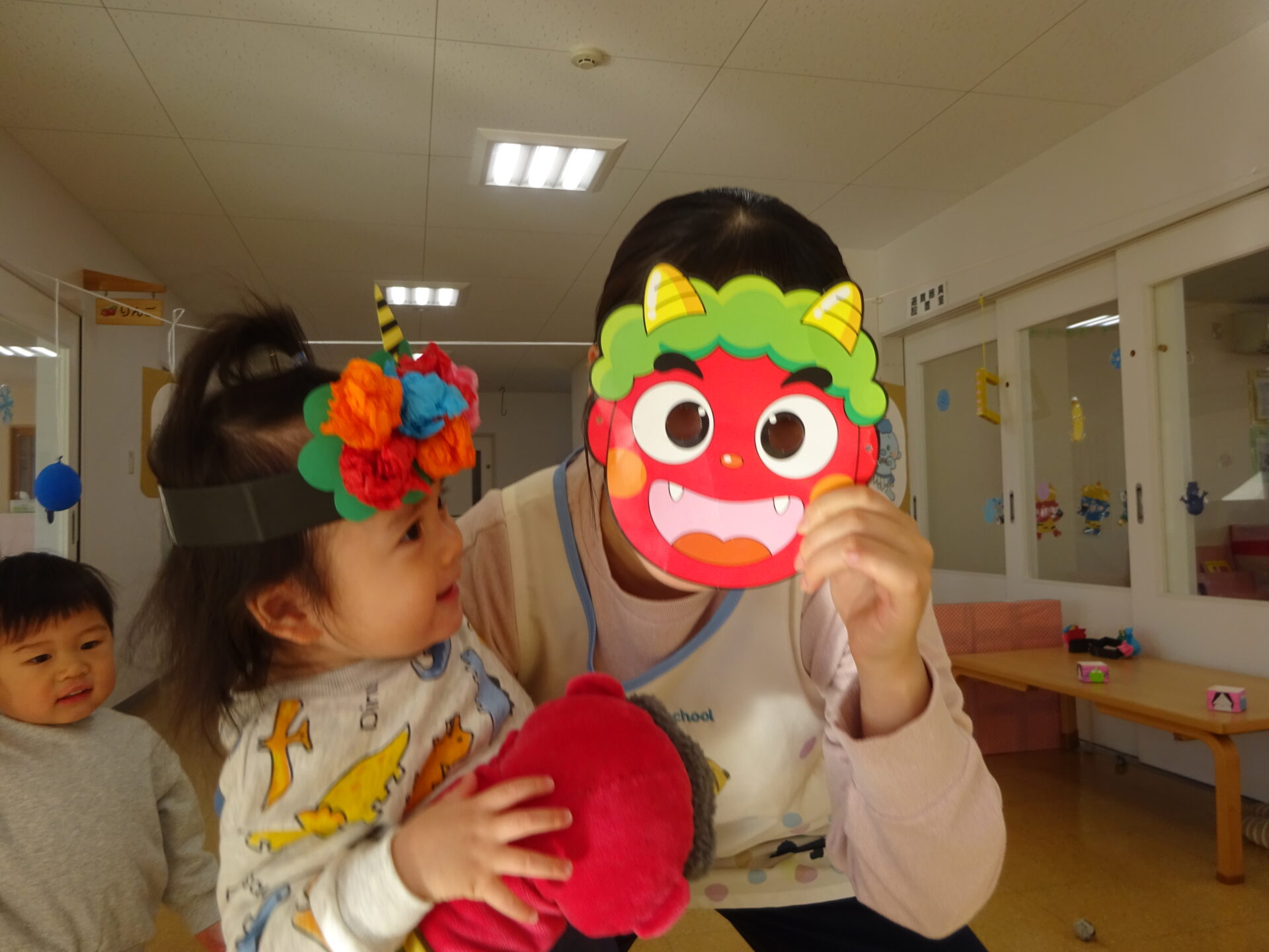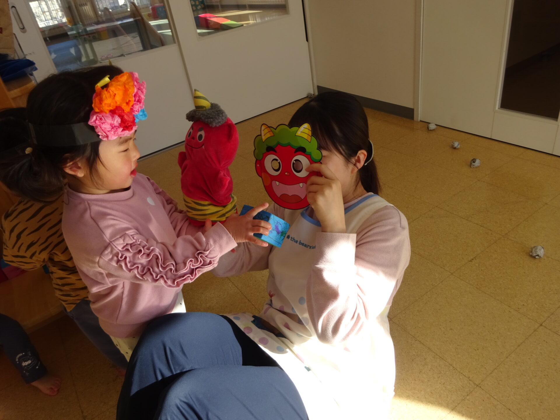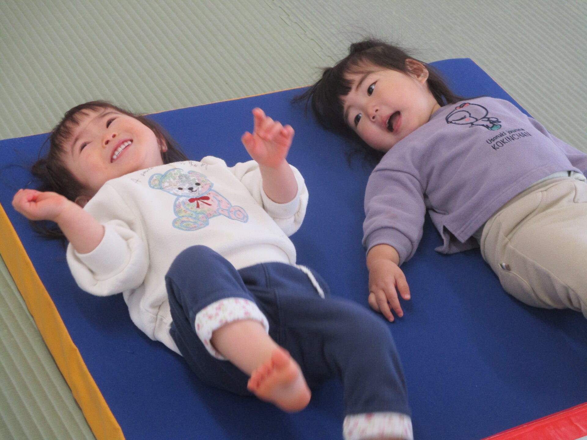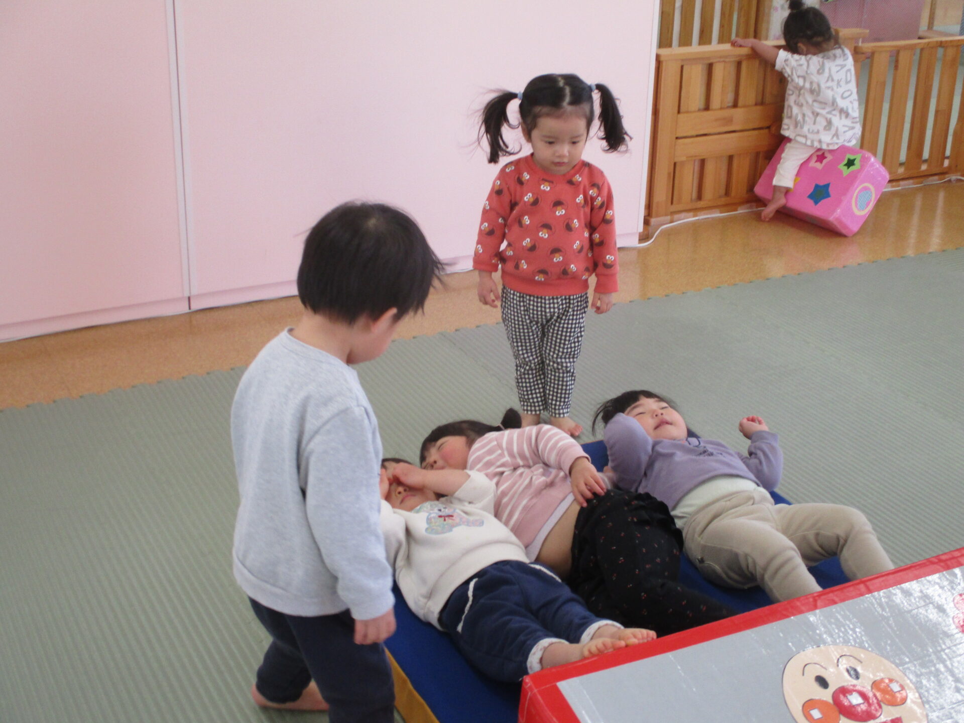 お部屋をのぞくと何だか楽しそうな声が聞こえます。みんなで輪っかの中に入ったり出たりしていると、先生が「ぼぉ〜ん・ぼぉ〜ん」と歌っています。どうやらおばけのでる時間なので寝ているのかな?何度もくりかえし子ども達は大喜びです。