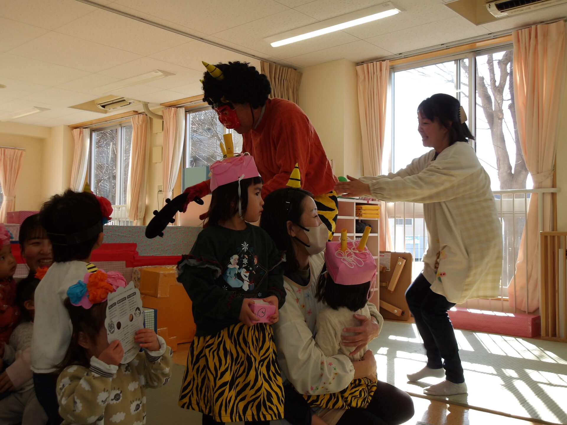 全園児集まるとたくさんのお客さんが、キッズのみんなに会いに来てくれましたよ。うさぎさんに雪だるまさん、恐竜にのった先生まで!