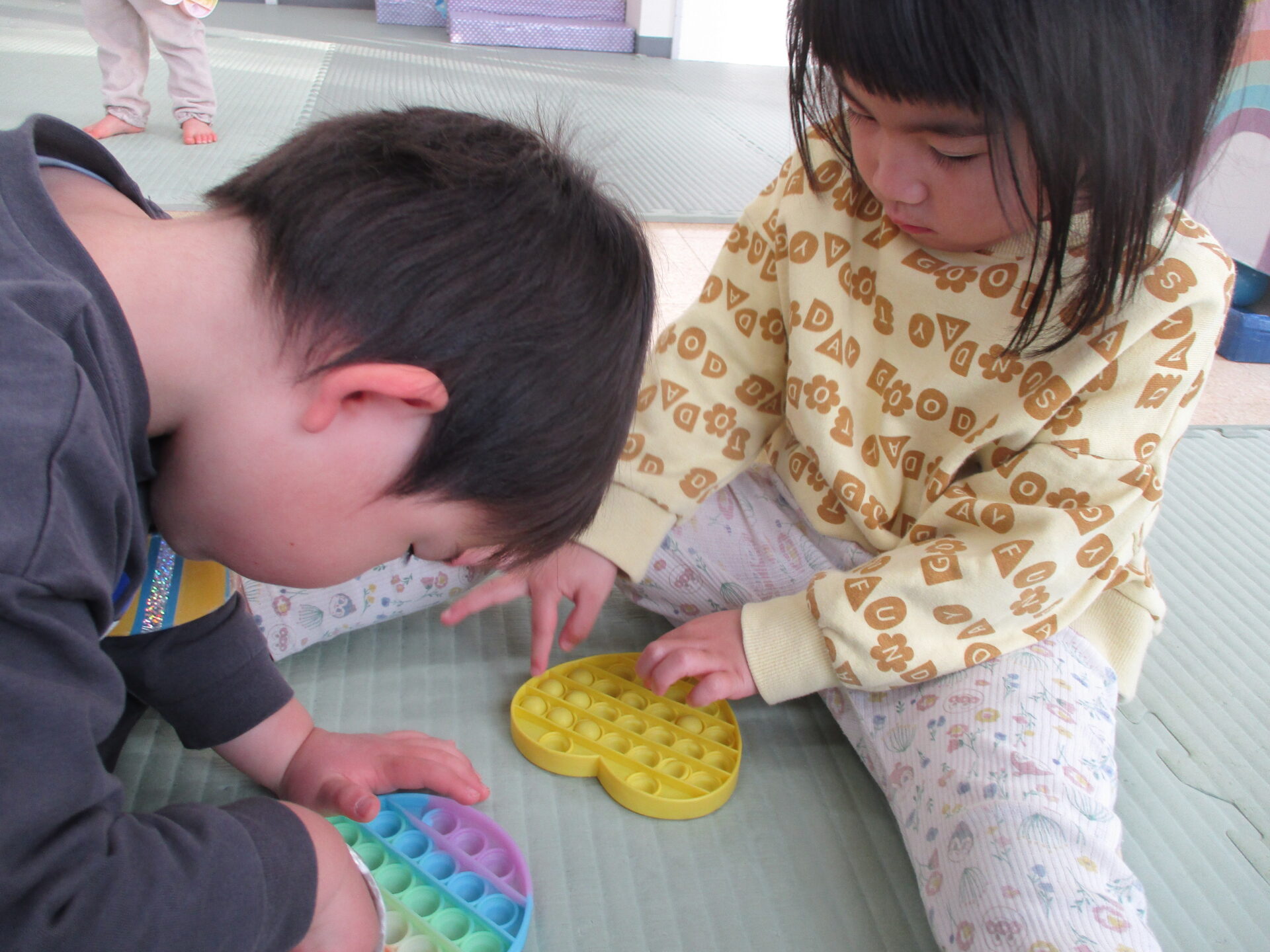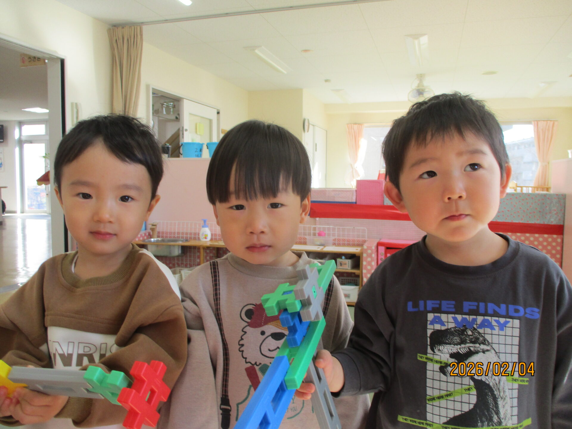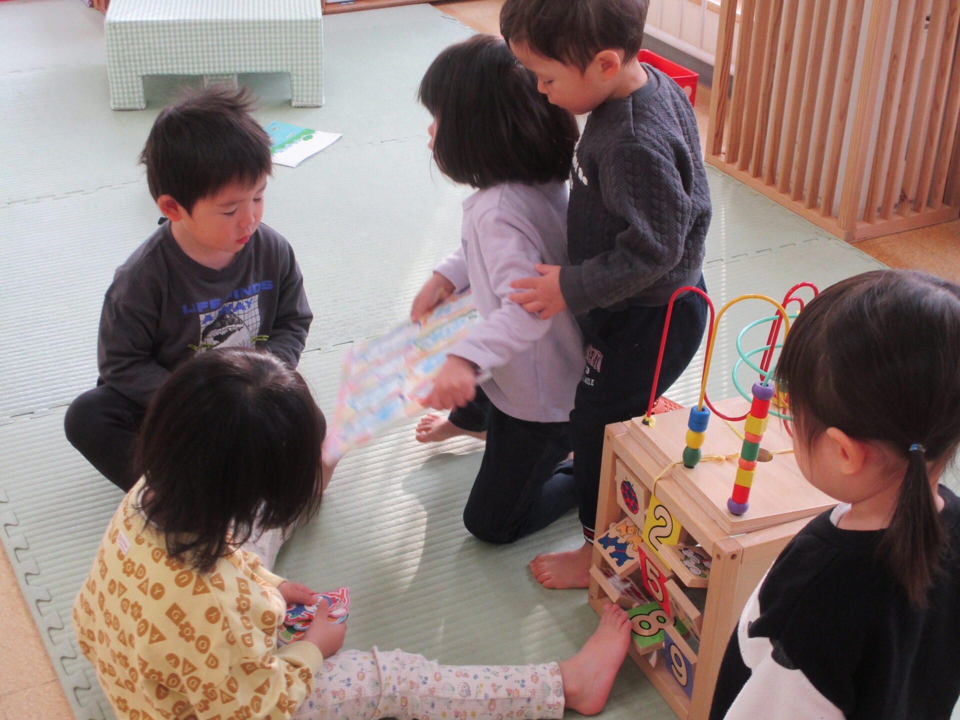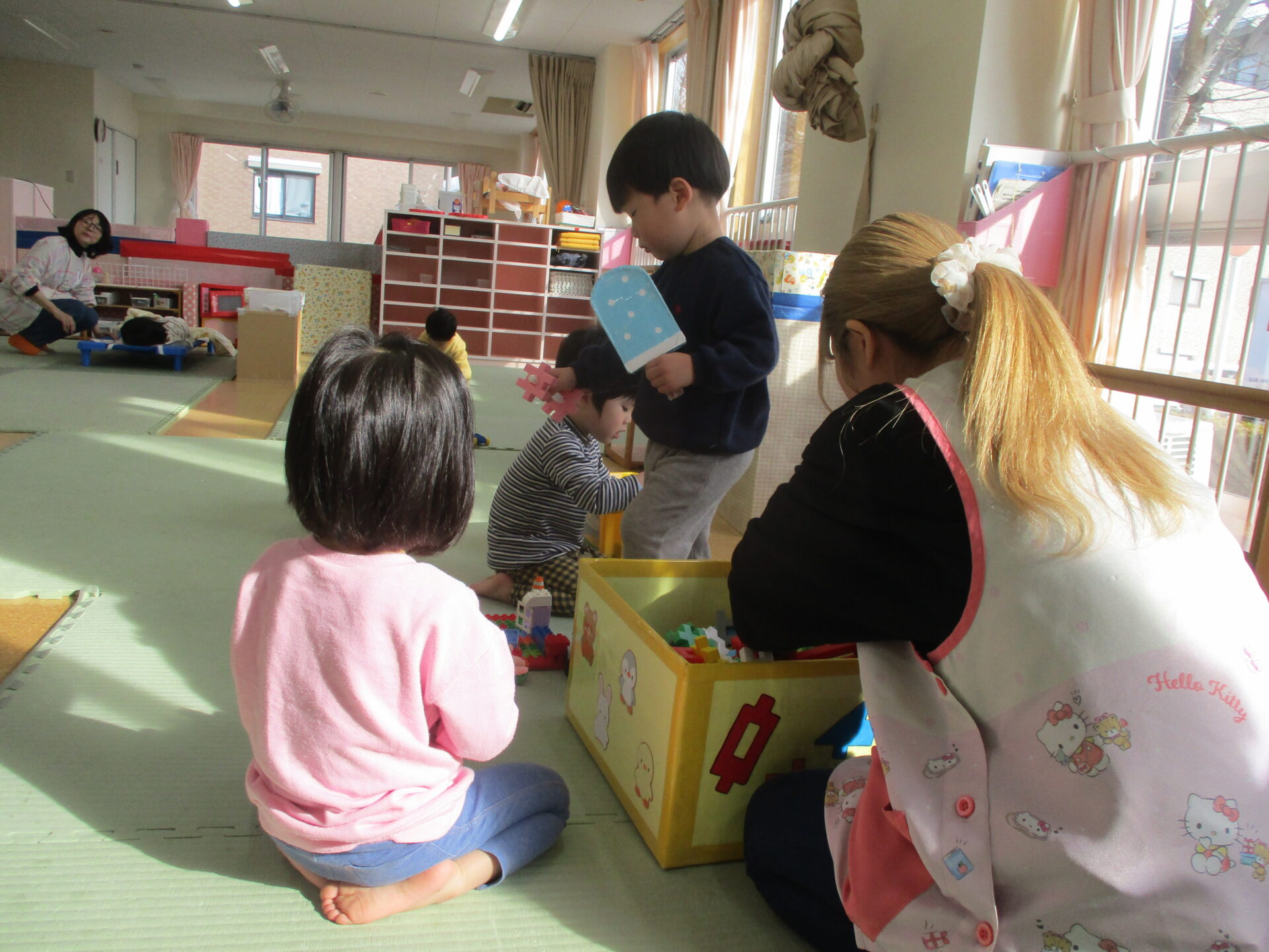ブロックの得意なお友達が、楽しそうに組み立てていると、「どうやって作るの?」と集まってきました。「こうやればいいんだよ」とやさしく教えてくれて、みんな楽しそうにしていました。かたはめパズルやパズルも人気で、もくもくとやる子もいます。