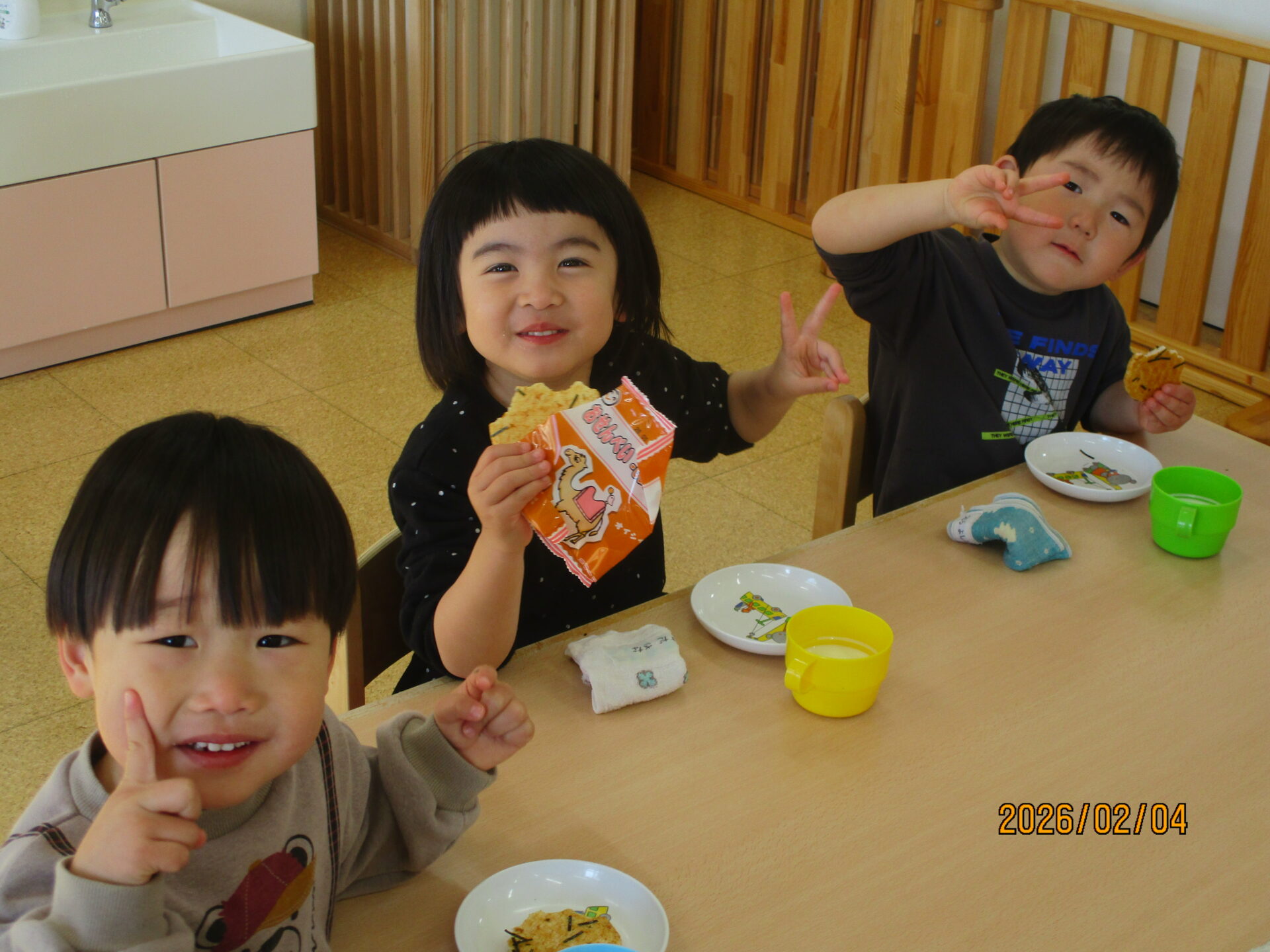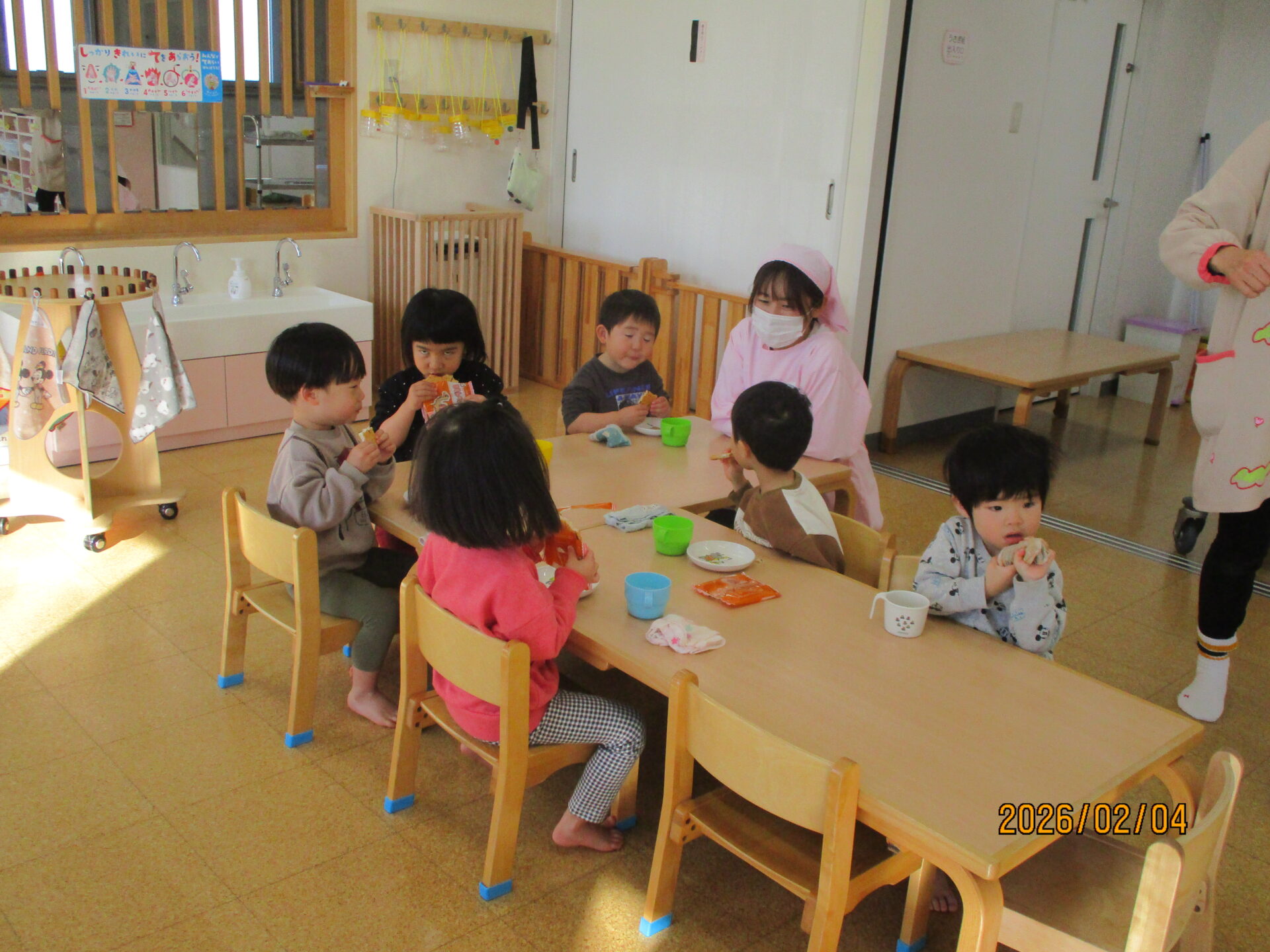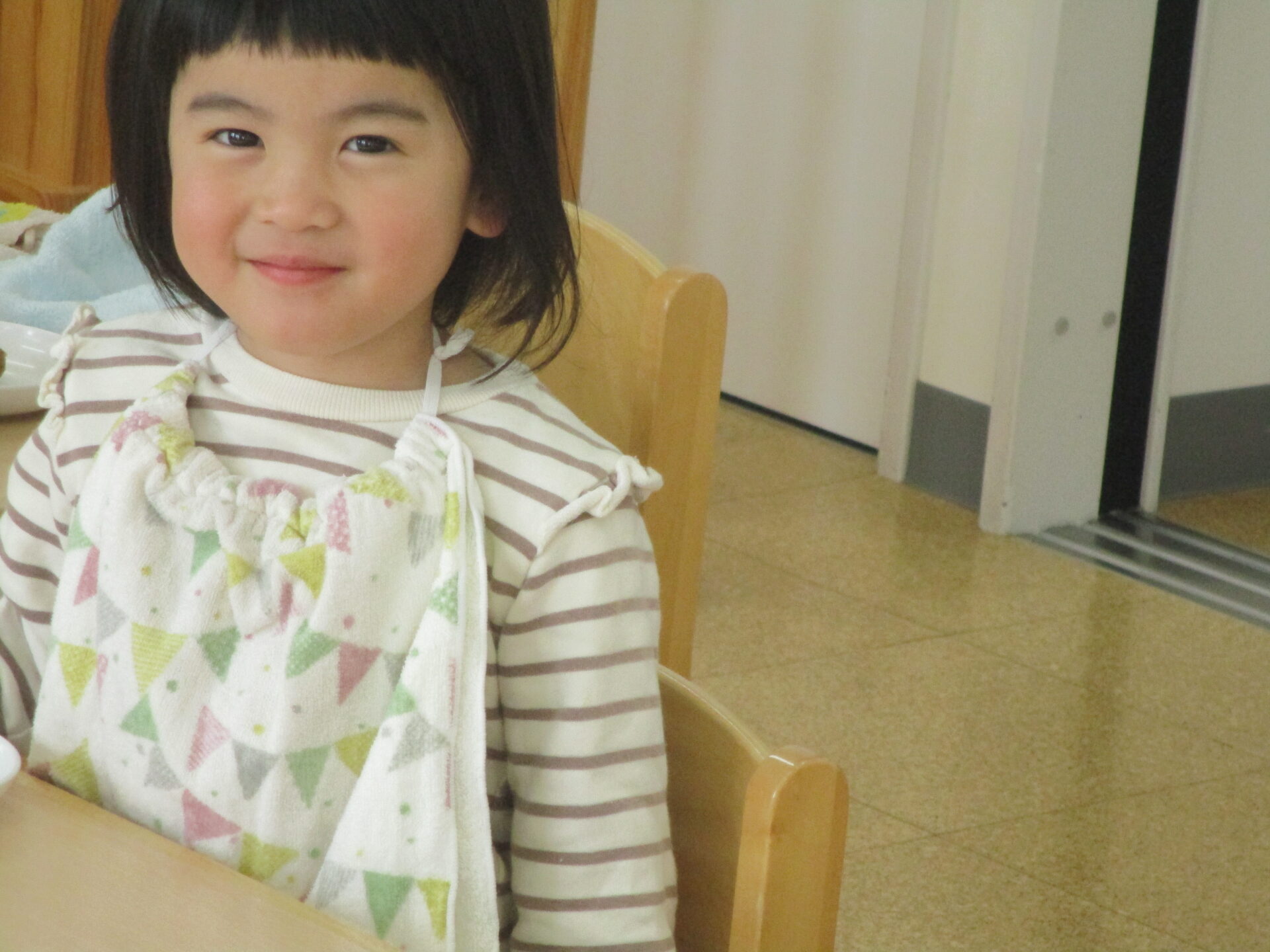 エプロンを自分でつけて先生が配膳してくれるのを、うれしそうに待つ子が多いです。配膳されると好きな物から、大きなおくちでパクリと食べていました。入園当初のことを思い出すと、大きくなったな~と感慨深くなりました。