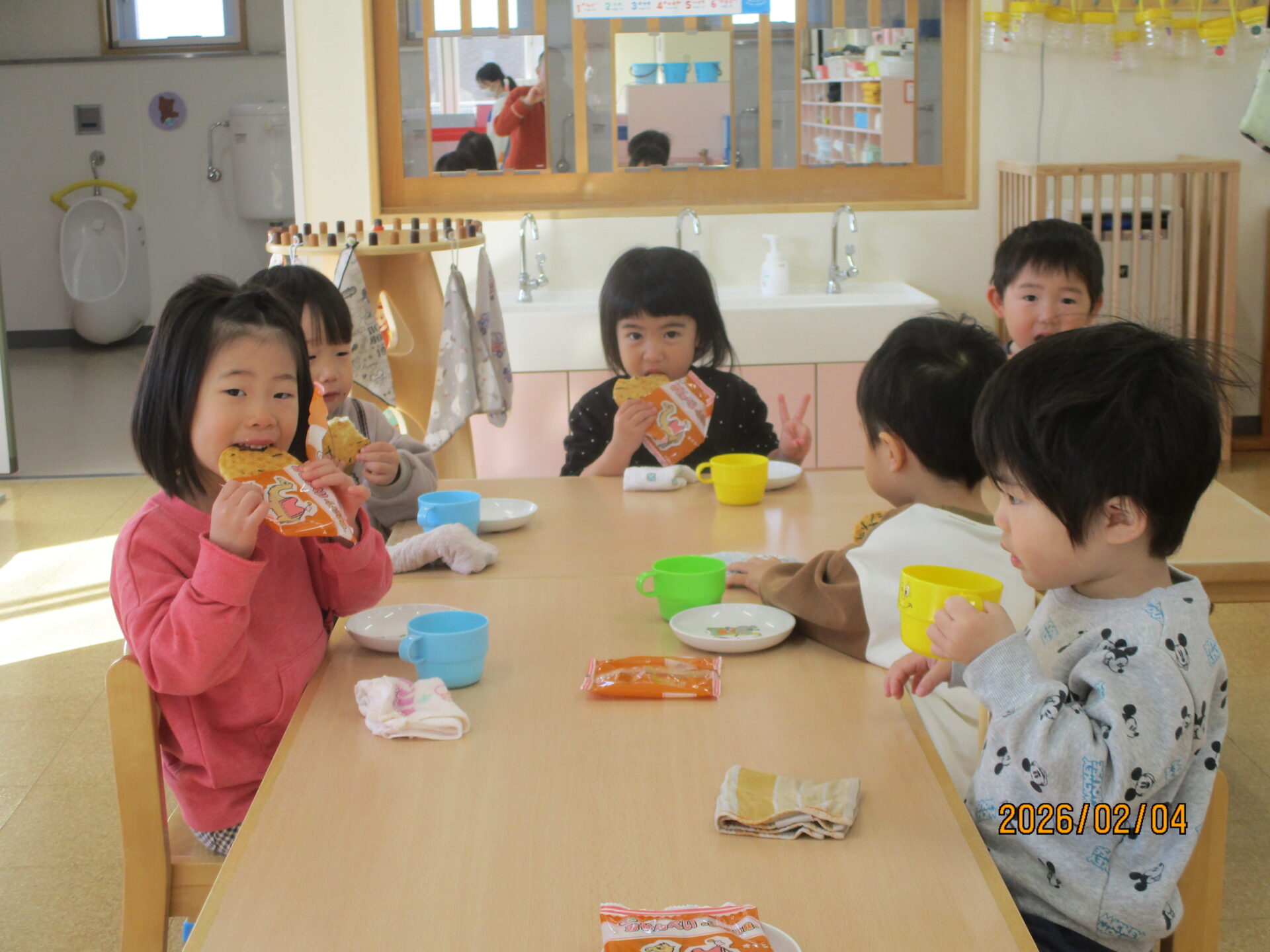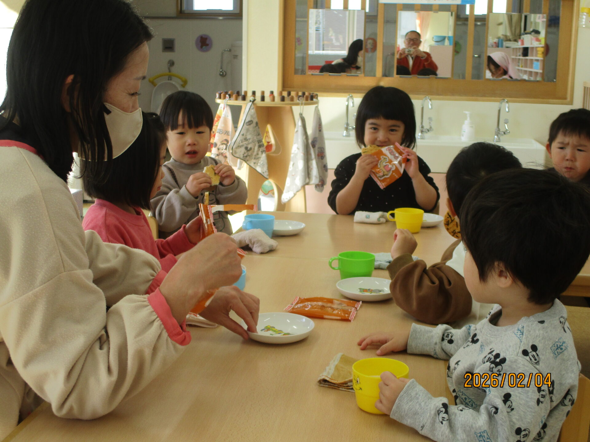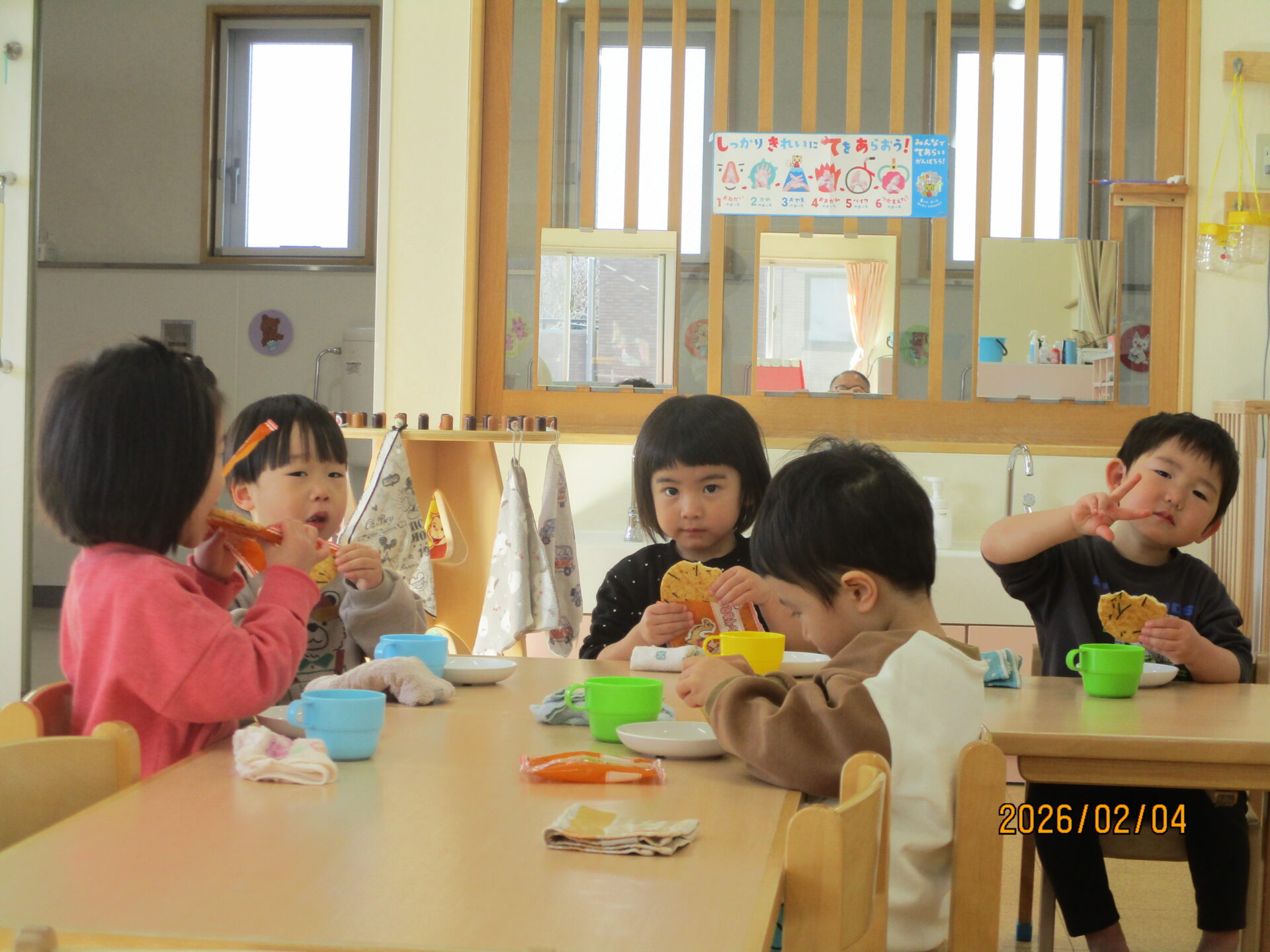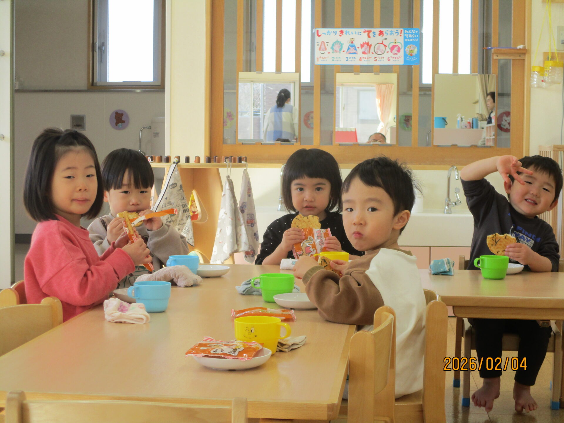 エプロンを自分でつけて先生が配膳してくれるのを、うれしそうに待つ子が多いです。配膳されると好きな物から、大きなおくちでパクリと食べていました。入園当初のことを思い出すと、大きくなったな~と感慨深くなりました。