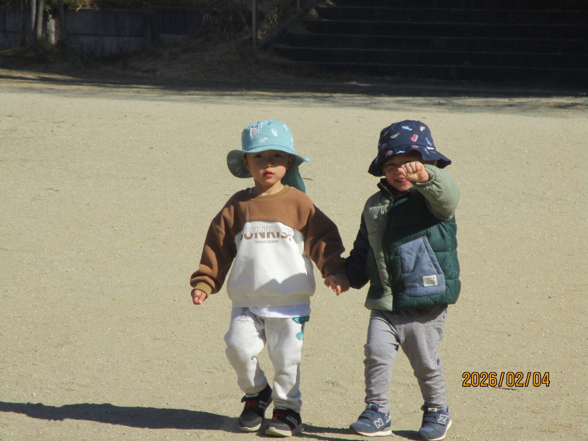外で遊ぶと、石をごはんにして遊ぶ子や園庭の隅から隅まで”よーいどん”する子も。好きな遊びを見つけて楽しんでいます。仲良しさんが手をつないでお歌を歌いながら散歩してました。楽しそうですね。