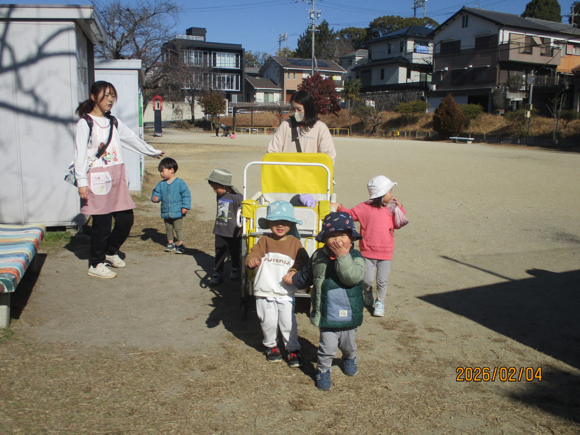 りんごくみでも歩いて散歩に行ける子が多くなりましたが、こんな魅力的なカートに乗ったりもします。散歩から戻ると手遊びを楽しんでいました。面白い手遊びに大盛り上がりです。