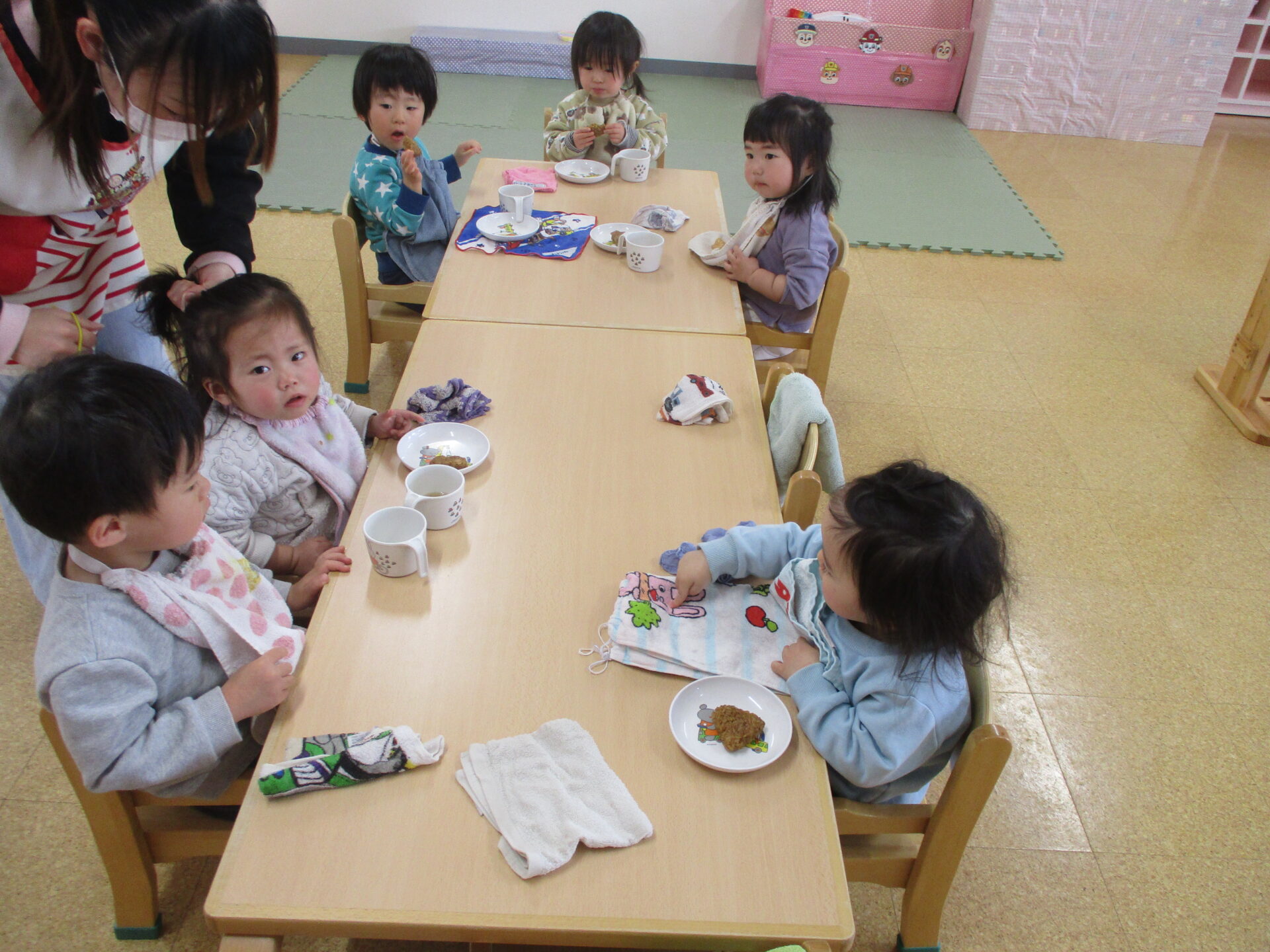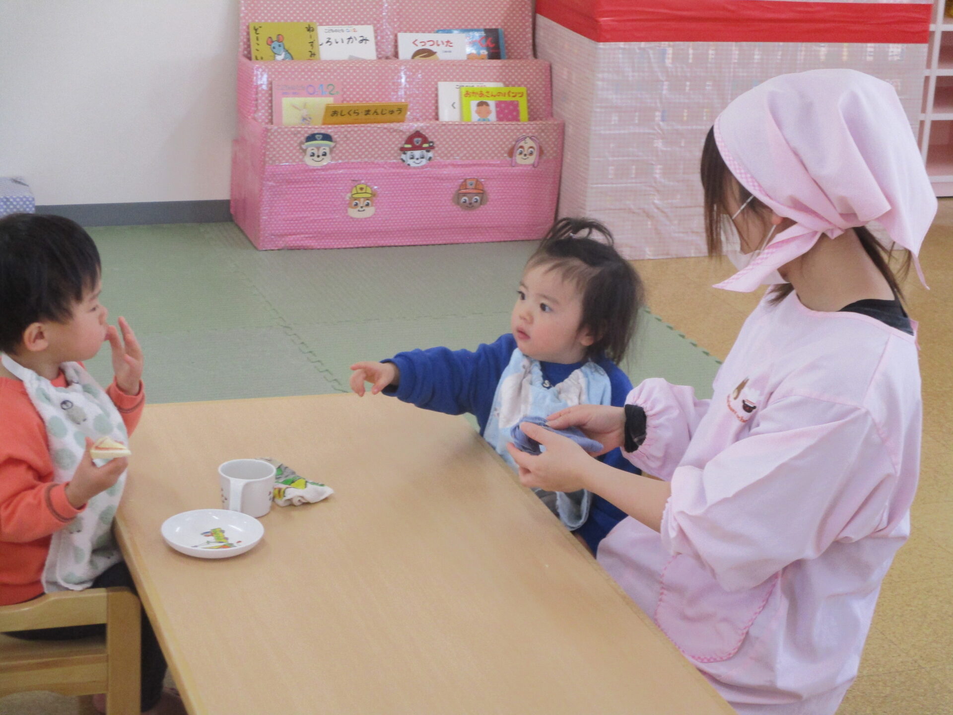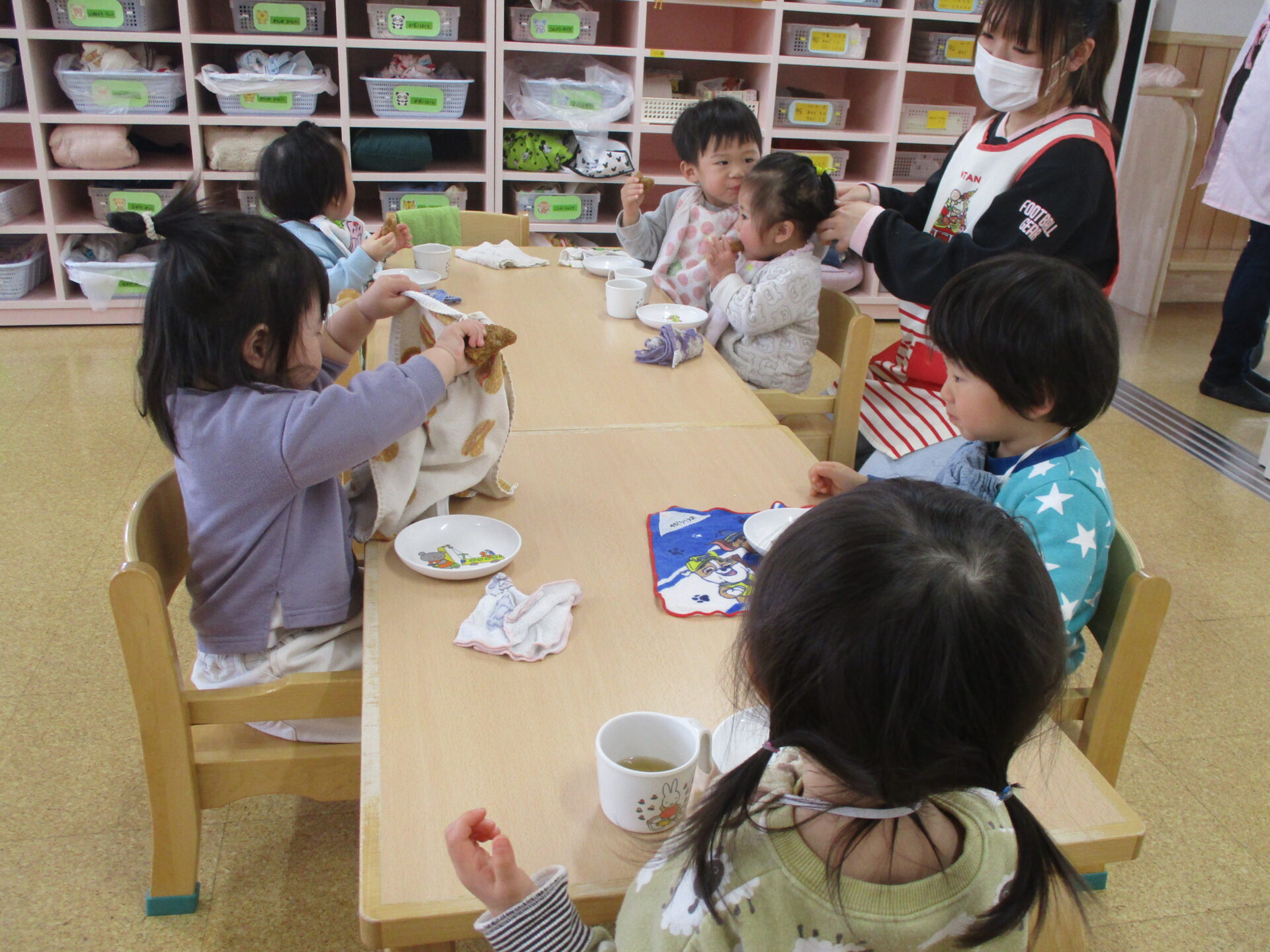 「ごちそうさまでした」と最後まで食べてお腹いっぱいの顔になっていますね。途中眠たくなってしまう子もいますが、自分で食べようとする意欲がモリモリです!先生が「おいしかったね」と声掛けすると大きくうなずいていましたよ。