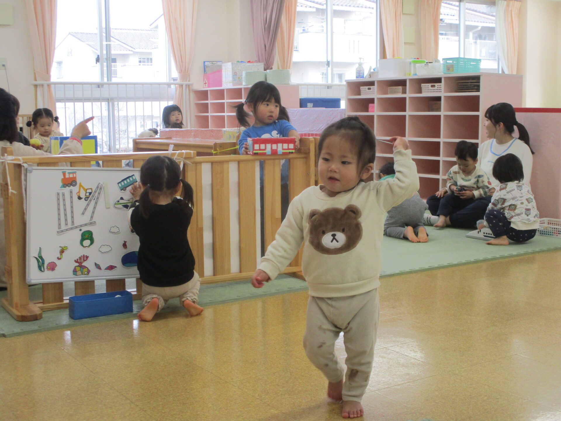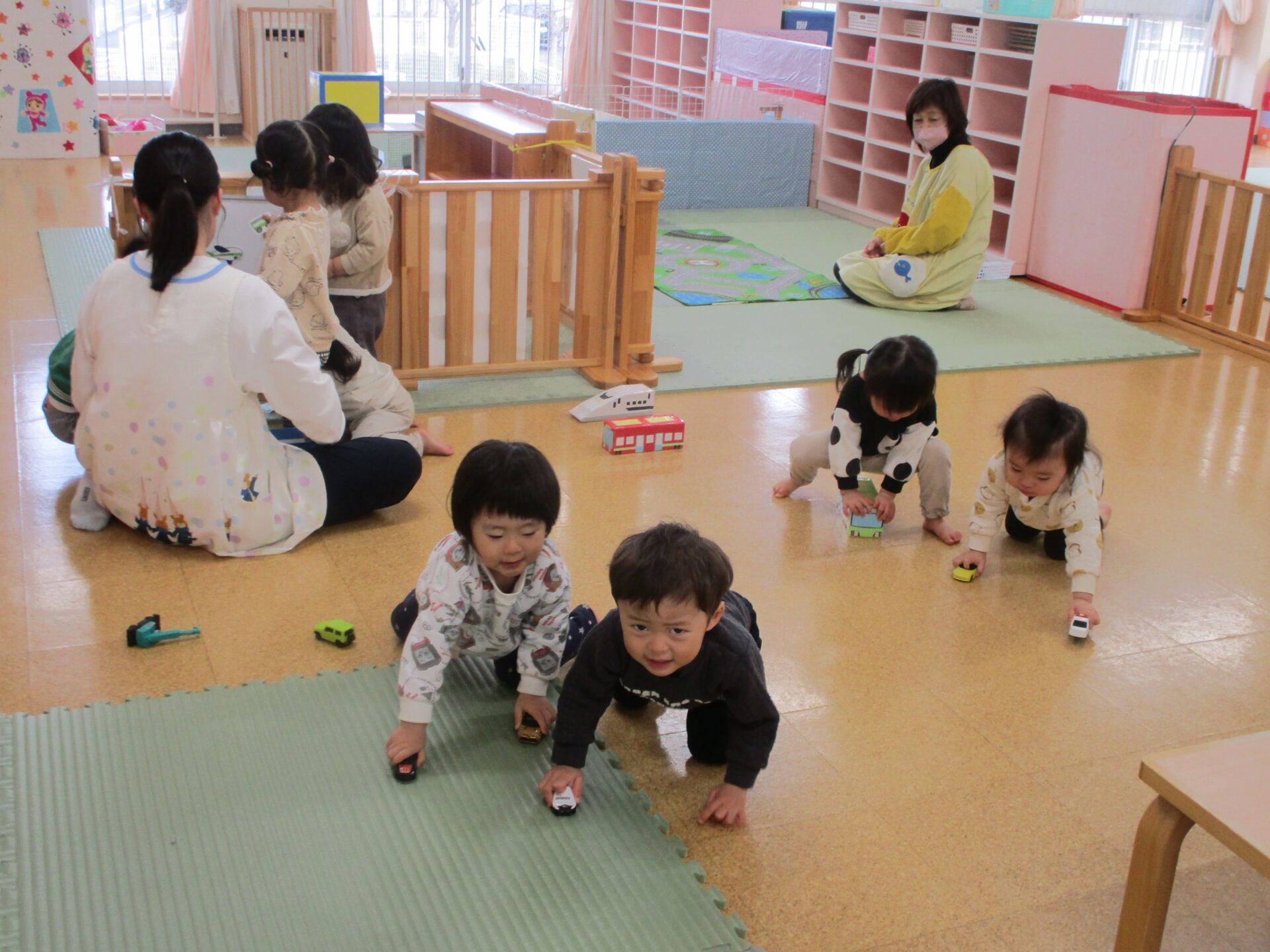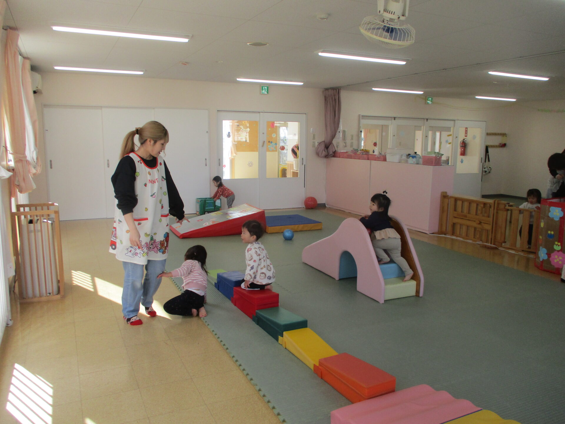 0.1.2歳児の乳児だけのこども園です。一人一人の子どもの欲求を満たし、安心できる保育者のもとで一人遊びができ、また、生活や遊びの中で、喃語や片言をやさしく受け止めながら発語を促し、保育者とのやりとりを楽しめるようにしています。家庭的な雰囲気の中で過ごせるよう、ゆったりと子どもの生活リズムに合わせた保育を心がけ、感情や意欲を十分に表現できるようにしています。春には芝生の園庭での外遊び、夏はウッドデッキでの水遊び、秋は近くの公園へ出かけています。幼い子ども達が、毎日の保育の中で季節を感じ、小さな発見を積み重ね、心の根っこの温かい子に成長することを願い保育をしています。