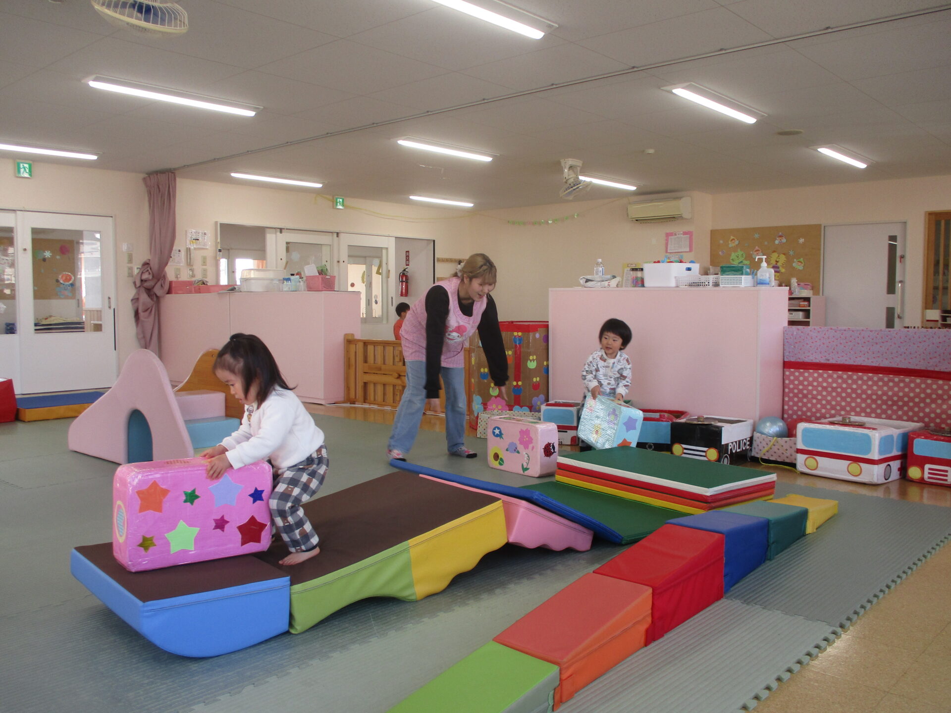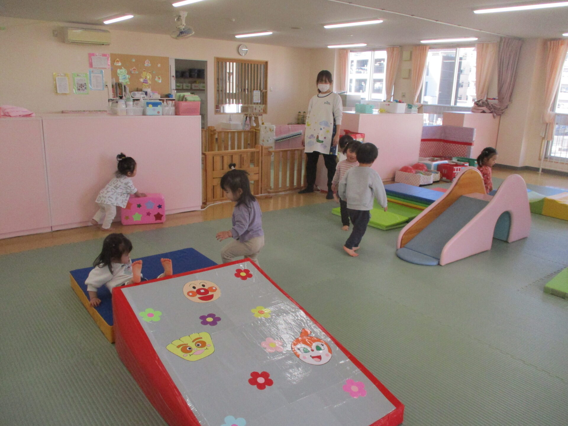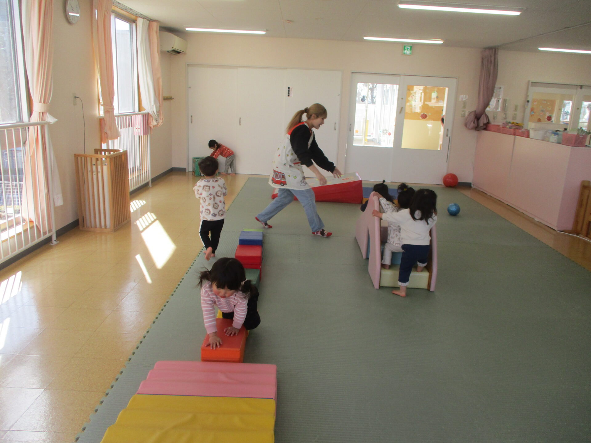 0.1.2歳児の乳児だけのこども園です。一人一人の子どもの欲求を満たし、安心できる保育者のもとで一人遊びができ、また、生活や遊びの中で、喃語や片言をやさしく受け止めながら発語を促し、保育者とのやりとりを楽しめるようにしています。家庭的な雰囲気の中で過ごせるよう、ゆったりと子どもの生活リズムに合わせた保育を心がけ、感情や意欲を十分に表現できるようにしています。春には芝生の園庭での外遊び、夏はウッドデッキでの水遊び、秋は近くの公園へ出かけています。幼い子ども達が、毎日の保育の中で季節を感じ、小さな発見を積み重ね、心の根っこの温かい子に成長することを願い保育をしています。