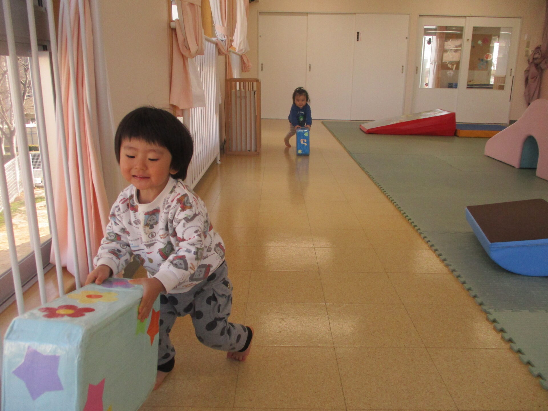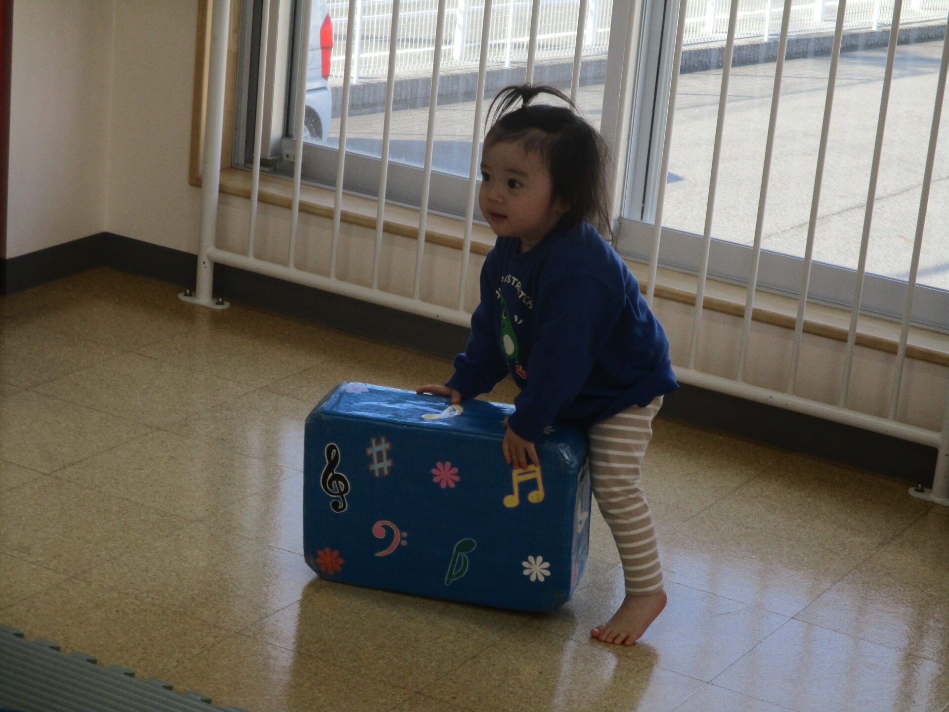 外に出ると虫探しスタート。ダンゴムシが隠れているのを知っているようです。その後、うさぎくみのお部屋で遊ばせてもらいました。カンパーイと言って盛り上がりました。小さな箱に二人で乗り込み、レッツゴーと手を上げています。