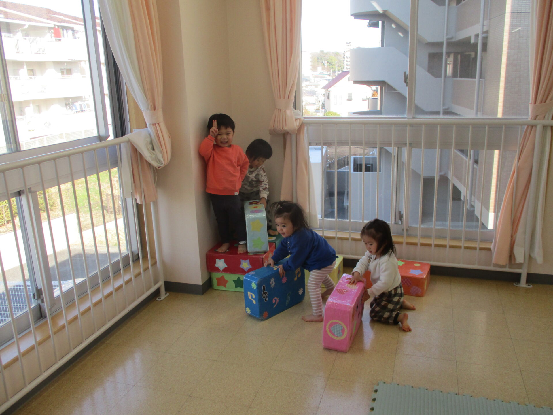 みんなが入れる、段ボールで作られたお家があります。先生も入りたいですが、なかなか入れません。大好きな絵本や玩具をもって入り、楽しそうですね。