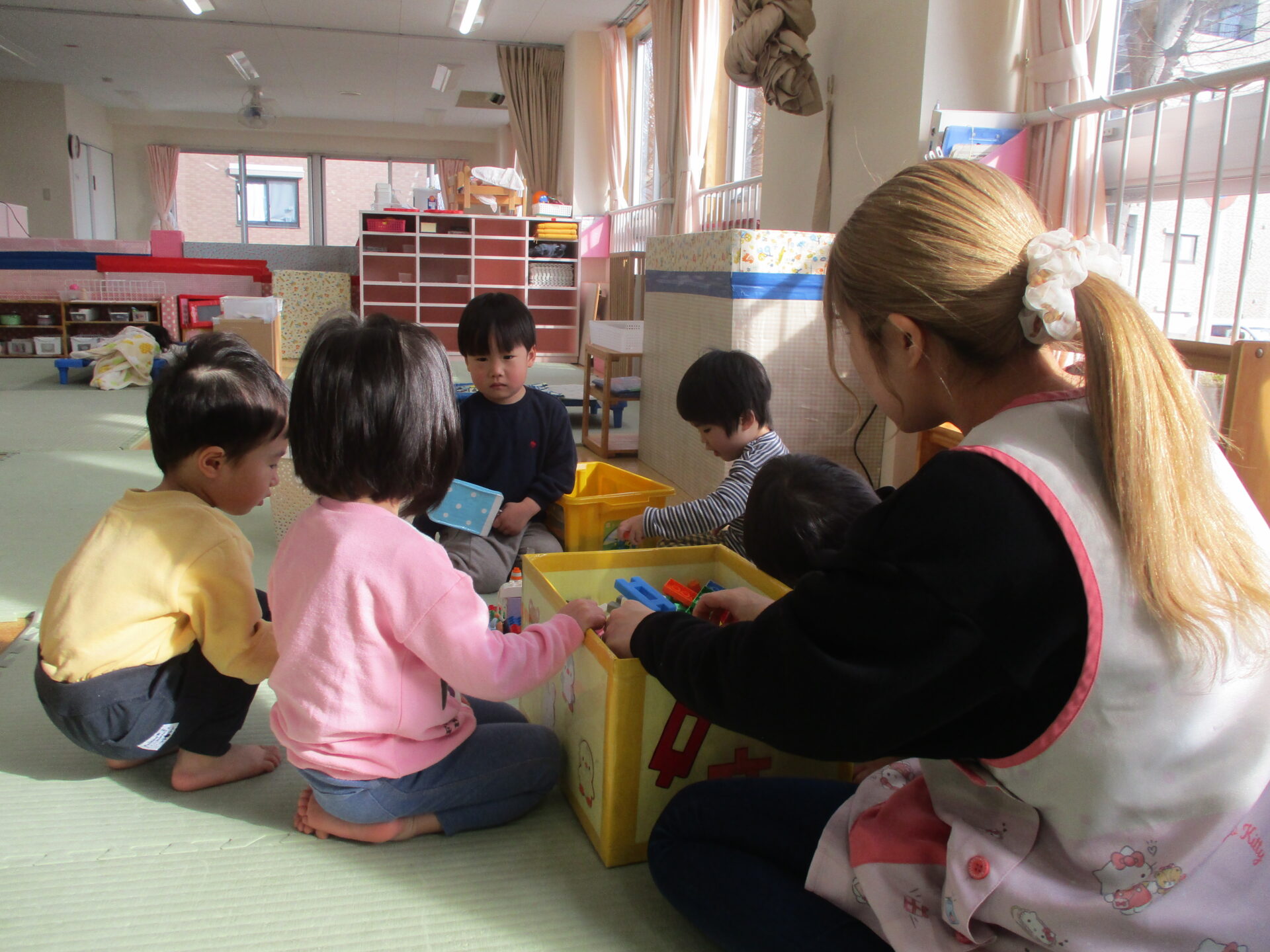 2歳児さんが延長保育中に、積み木遊びに夢中になり遊んでいました。