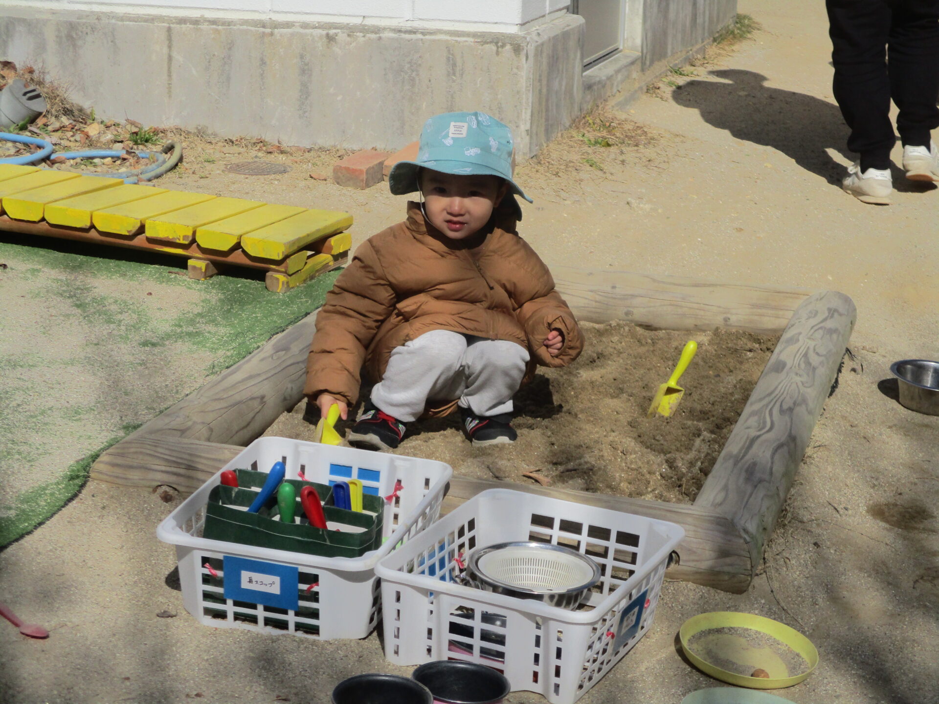 昨日のおまけになりますが、園庭で虫を探すのが大好きです。ダンゴムシにちょうちょ、ミミズまで。いろんな虫を探してみんなに知らせてくれます。ちょうちょをつかまえてくれる子もいます。すごい!と写真撮ったら飛んで行ってしまいました。子ども達から「ダンゴムシつかまえよ」と誘ってくれるほどです。砂場のお皿とスプーンでダンゴムシをほじほじ探すのが、子ども達の定番スタイルです。ミミズ等触れない子もいますが、気になって気になってで、覗き込む姿がかわいらしいです。