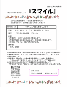 12月22日に親子で遊びましょう【スマイル】を行います。参加希望の方は、電話にてお申込みください。