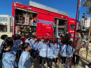 今回は、救急車の中を見せてもらったり、消防車に備わっている器具の説明を受け、どの子も興味津々で防災意識が高まりました。