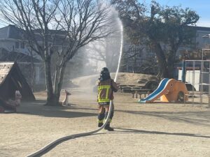 先生たちの水消火や女性消防士さんによる放水を見せてもらいました。