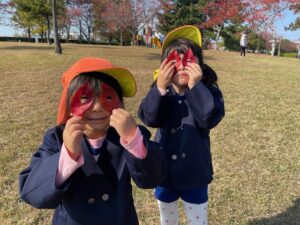 どんぐりや松ぼっくりを見つけたり、きれいに色づいた葉っぱを集めて、自然を満喫しました。