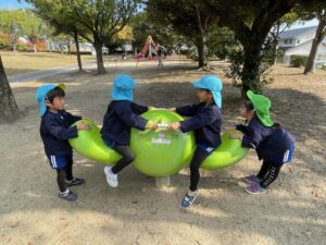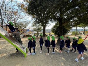 空が高く澄んだ晴れの日に、年長・年中・年少児全員で、土橋公園に園外保育に出かけました。