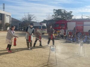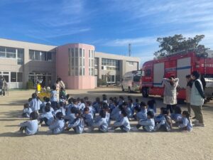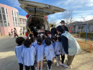今回は、救急車の中を見せてもらったり、消防車に備わっている器具の説明を受け、どの子も興味津々で防災意識が高まりました。