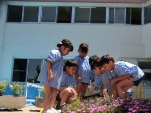 年長児が、大根とラディッシュの種をプランターに植えました。