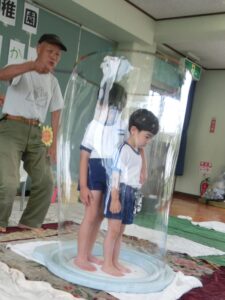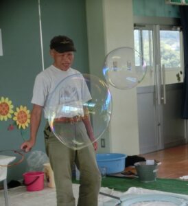 PTA主催でシャボン玉遊びを行いました。 みんな、大きいシャボン玉に大喜び(≧▽≦)