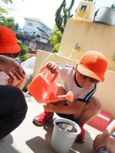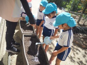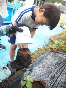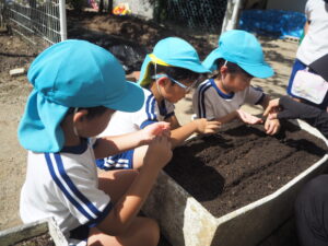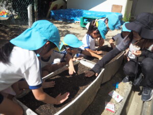 「できるのが楽しみだね」とみんなで土をかけ、おいしくなるようにみんなでおまじないをかけました。