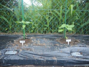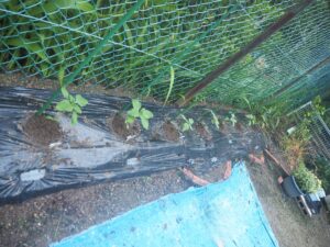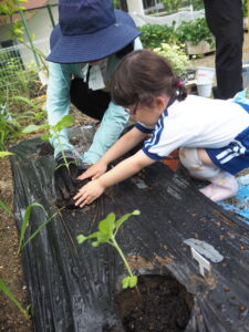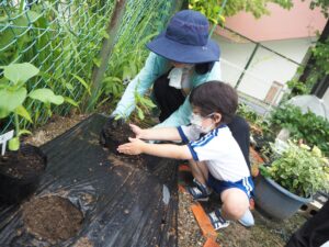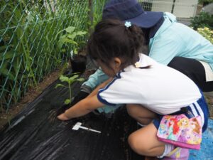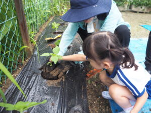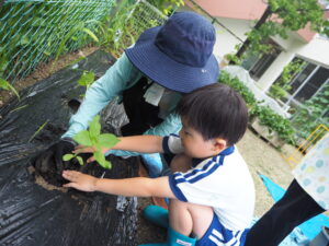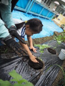 5月 さくら組さんがトマトとトウモロコシ、キュウリ、バジルの苗を植えました。