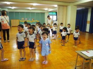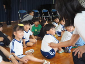 五ケ丘の年長さんの人数の多さにびっくりして、少し緊張気味の松平の年長さん。