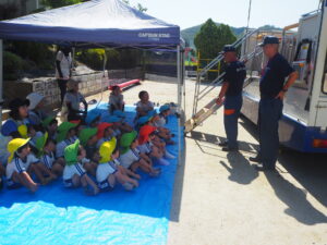 今回は消防署松平支所の方々に訓練の様子をみていただきました。消防車と救急車の展示もあり、興味津々な子ども達でした。