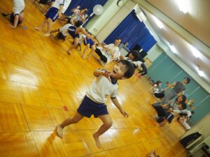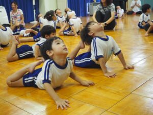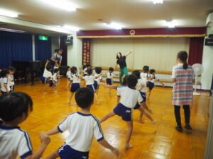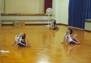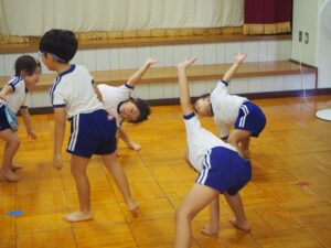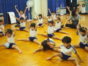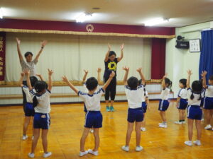 昨年度も行ったPTA主催のキッズダンス教室。初めに柔軟体操を行いました。