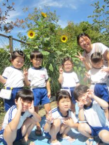 自分の背丈より大きくなったひまわりをみて満足気な表情の子どもたち。