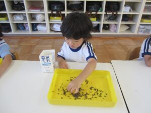 年長児が近くの公園に遊びに行ったとき、たくさんどんぐりを拾ってきました。