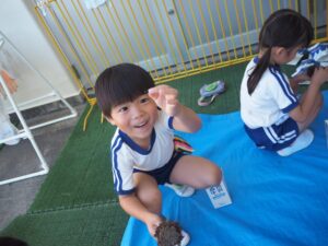 芋ほりに出かけました。大きなお芋をスコップ使って堀り出し、大喜びでした。
