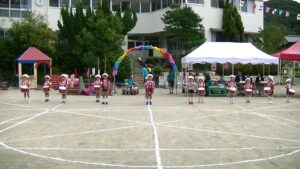 運動会日和になりました。暑い中毎日練習をしてきたお遊戯や鼓隊演奏などを