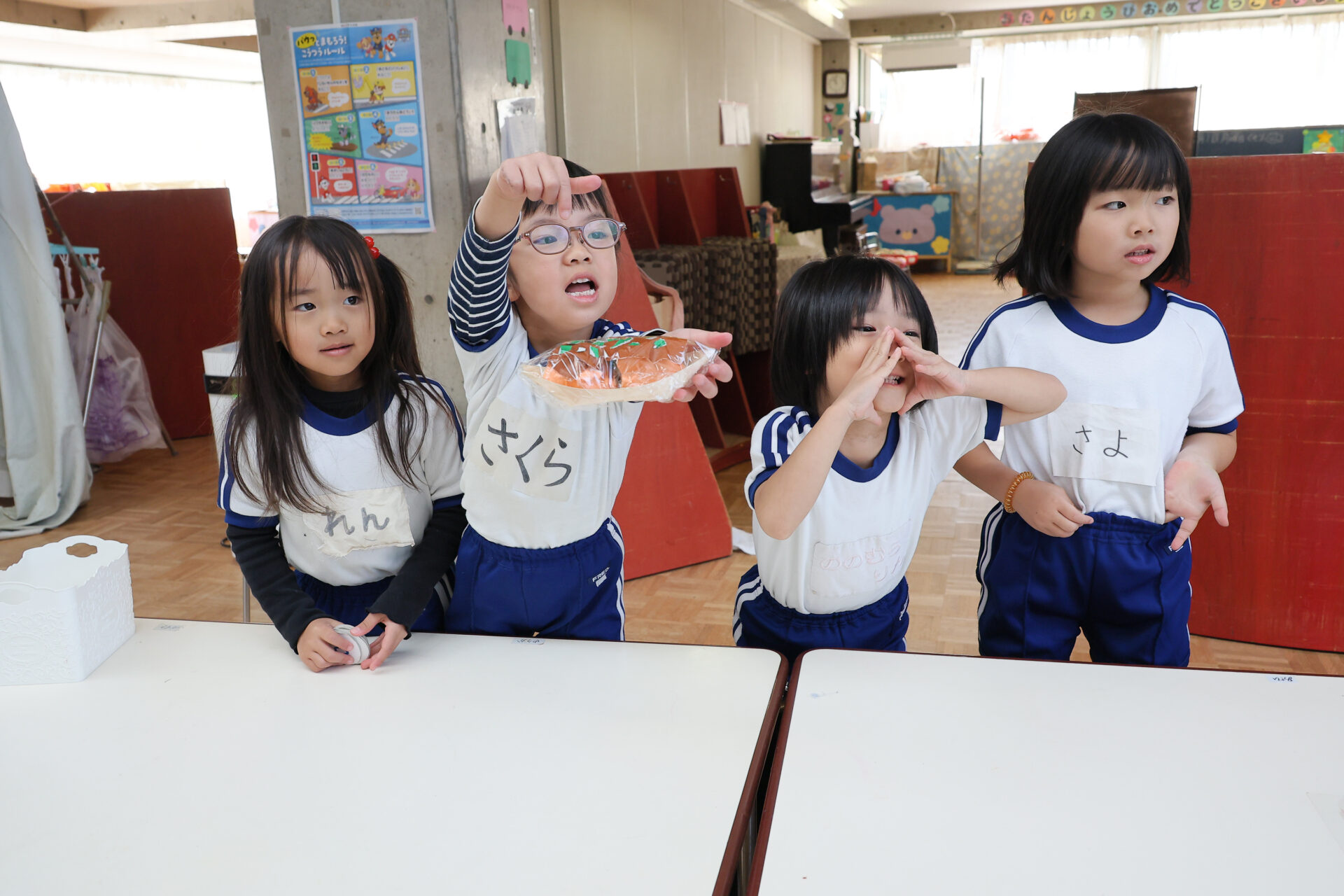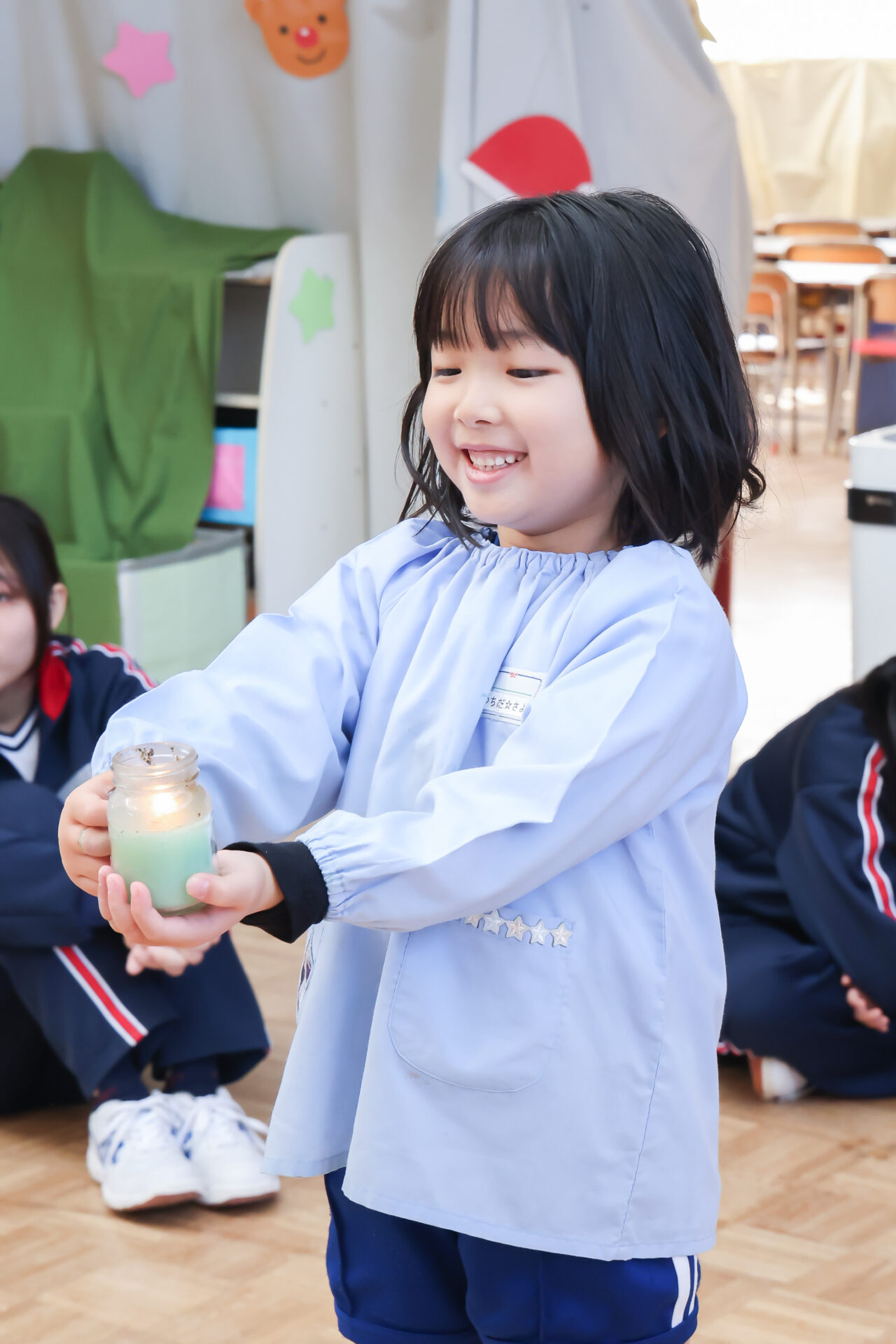 年中さんと年少さんがびっくりしてくれて、年長さんは「大成功!」と大喜びでした。年中さんが手を繋いでくれたおかげで、年少さんも最後までまわる事ができました。