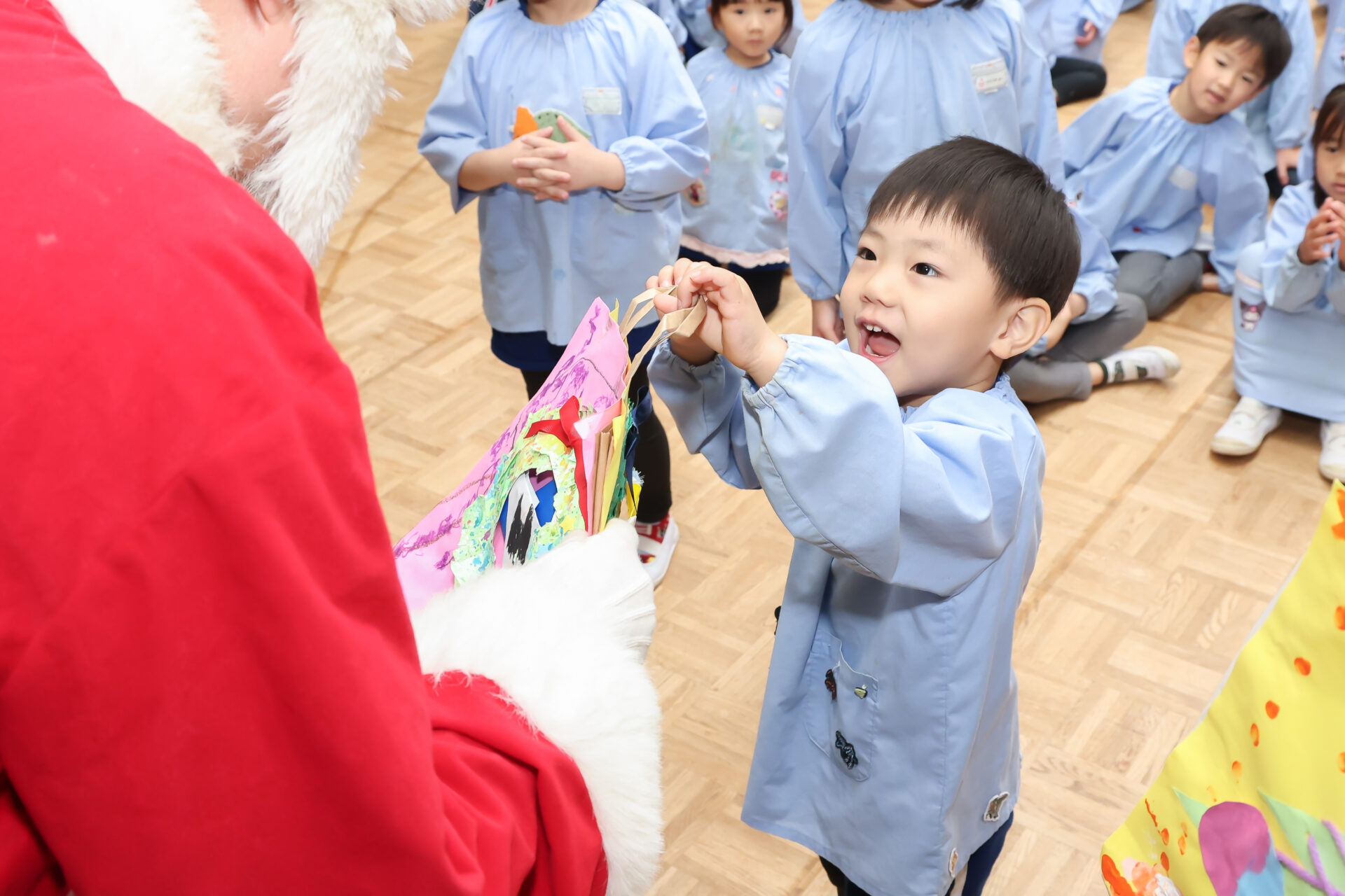 いっしょにじゃんけんゲームをしたり、サンタさんに質問したり。サンタさんからひとりひとりプレゼントを受け取り「なにがはいっているのかな?」とワクワクしていました。