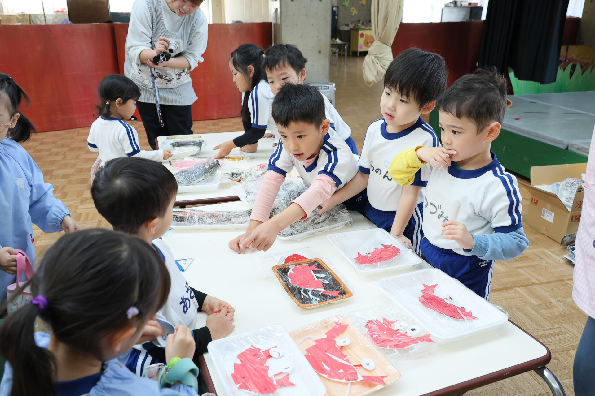 先生の「スタート!」の合図と同時に、「いらっしゃいませ~!」「新鮮なお魚ですよ」「フランクフルトもありますよ!」と元気いっぱいの声が響きました。
