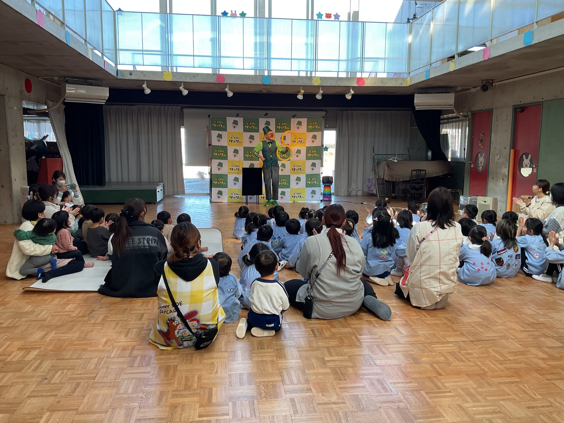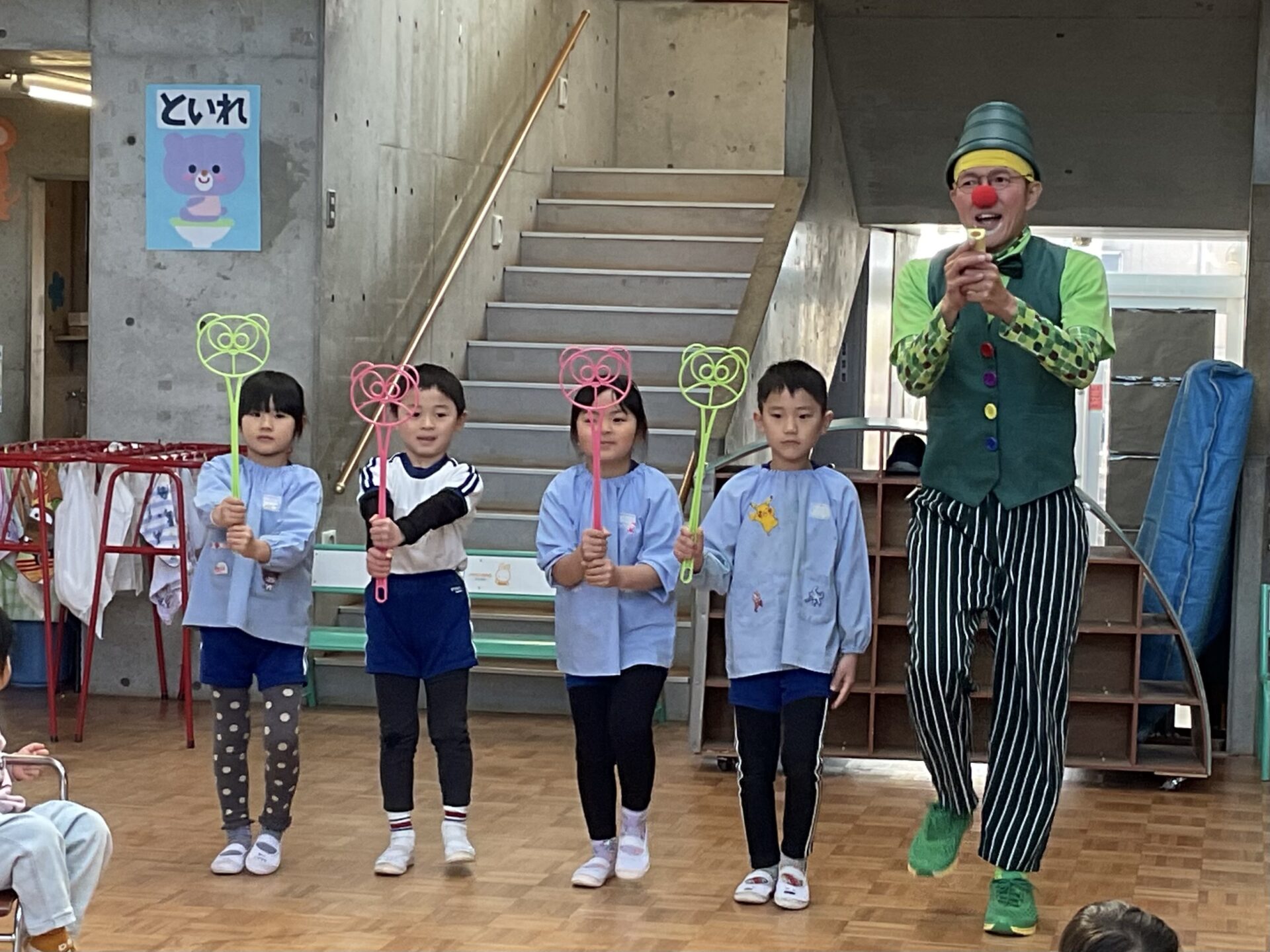 登園すると「今日はピエロが来るんでしょ?」と、朝から楽しみにしている子どもたち。「どんなピエロなんだろう?」と、お友達同士で会話を弾ませる姿が見られました。