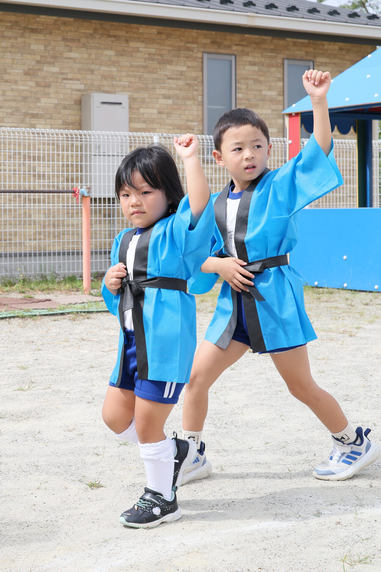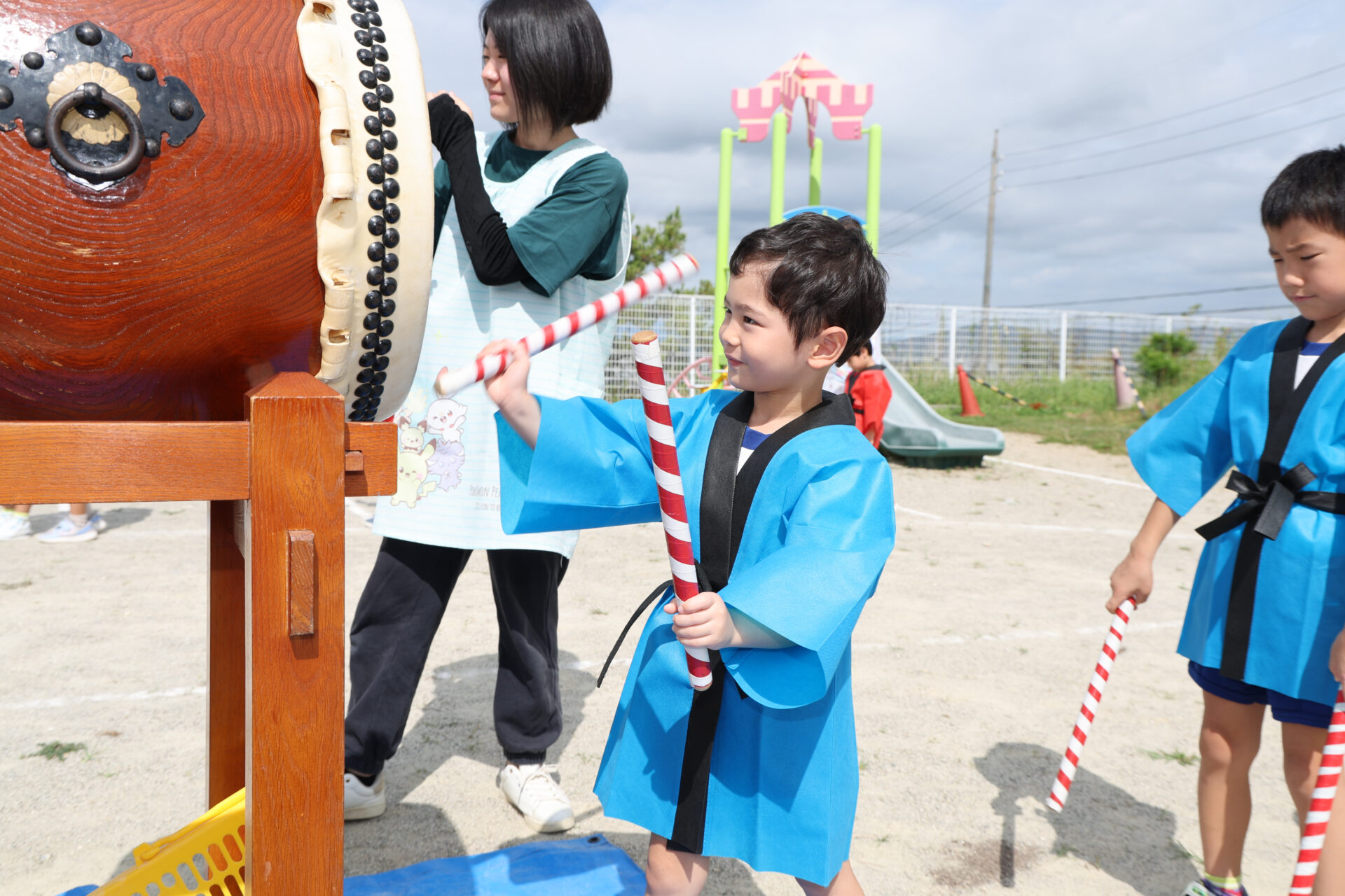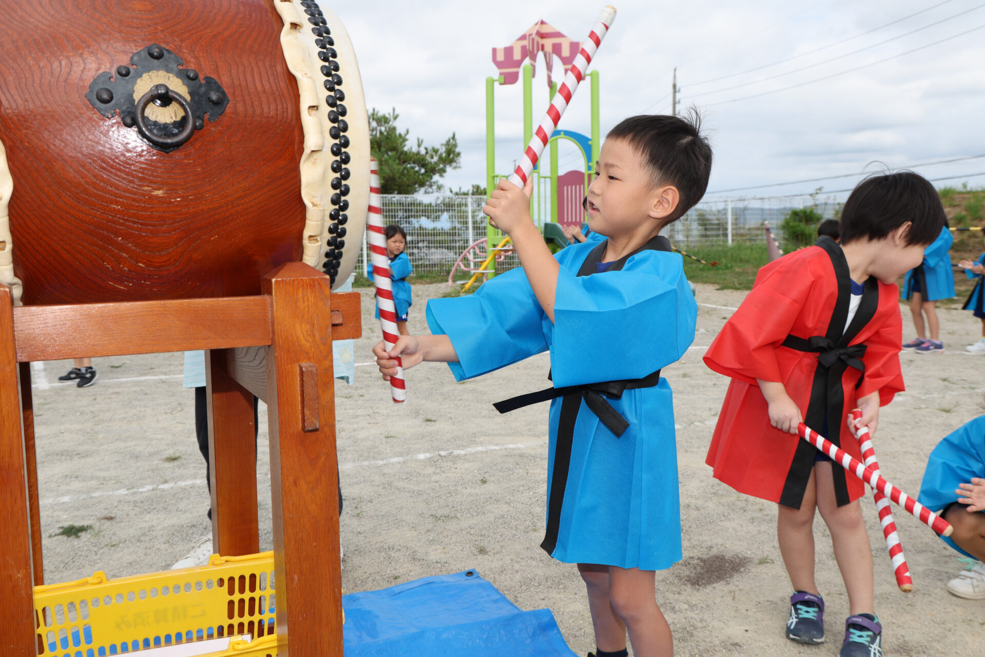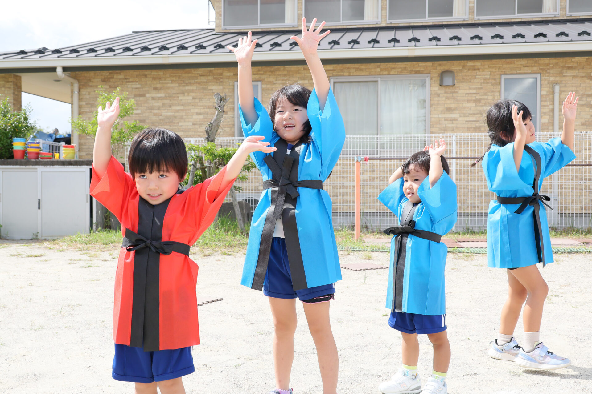 法被を着て、準備ばっちりの子どもたち。年少組さんは、初めての法被に目をきらきら輝かせていました☆