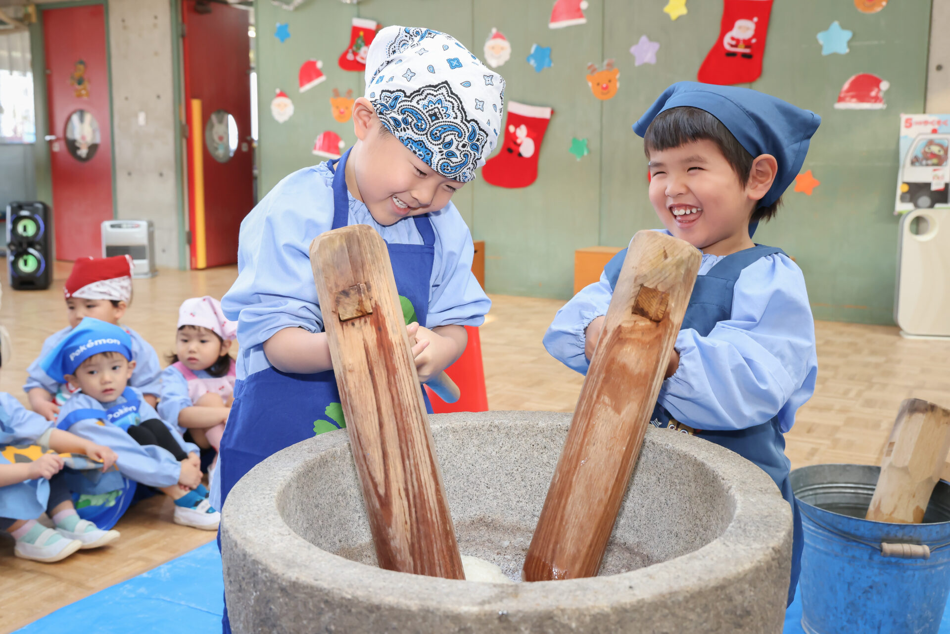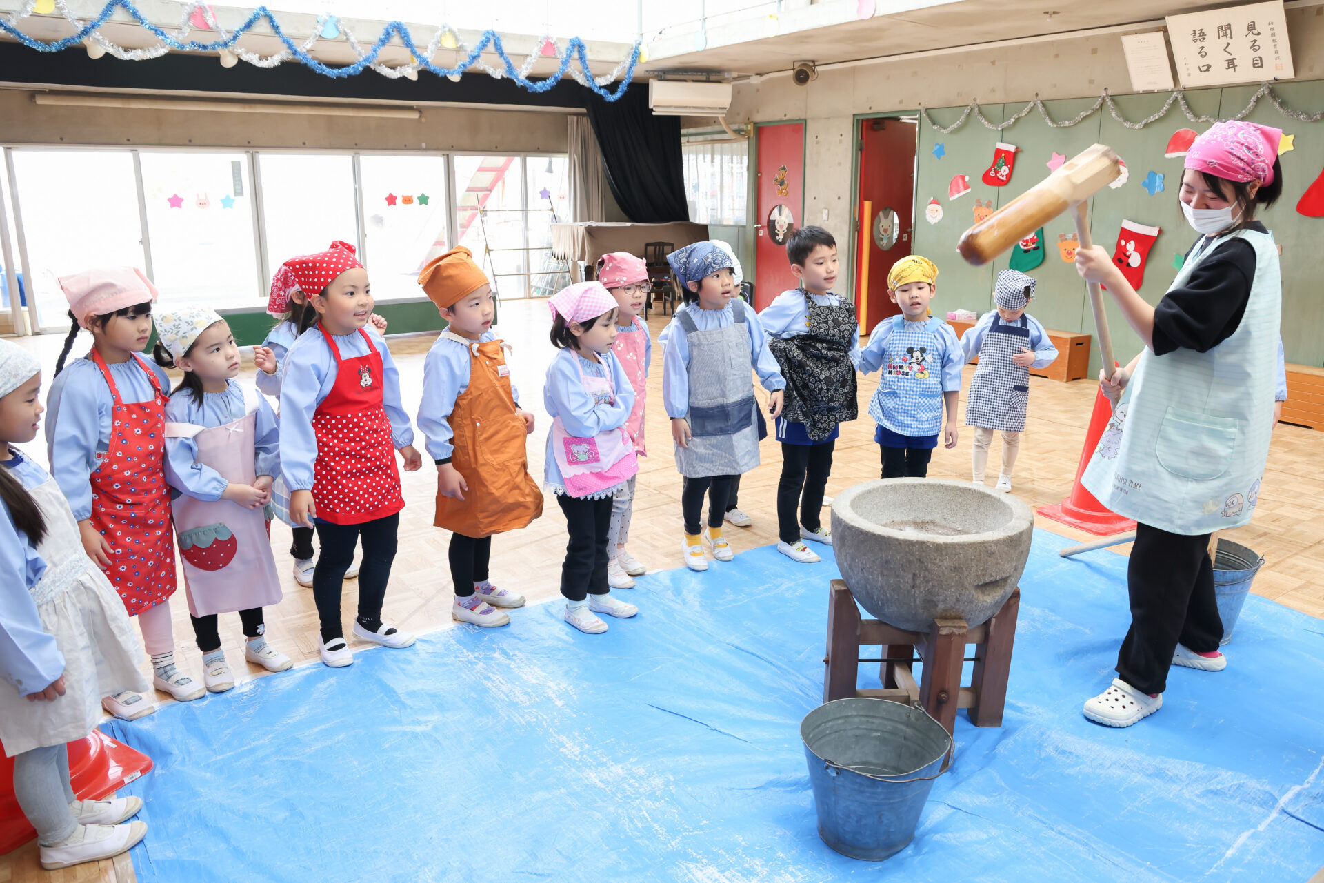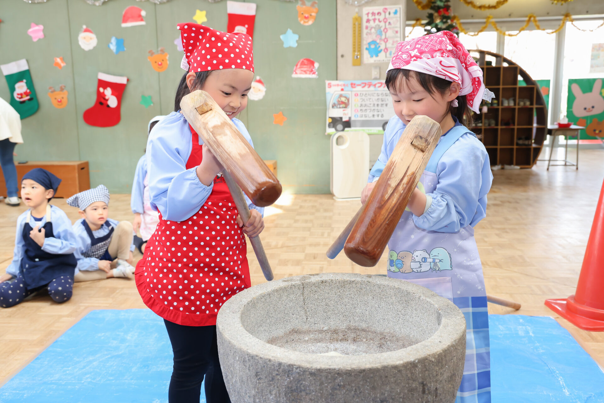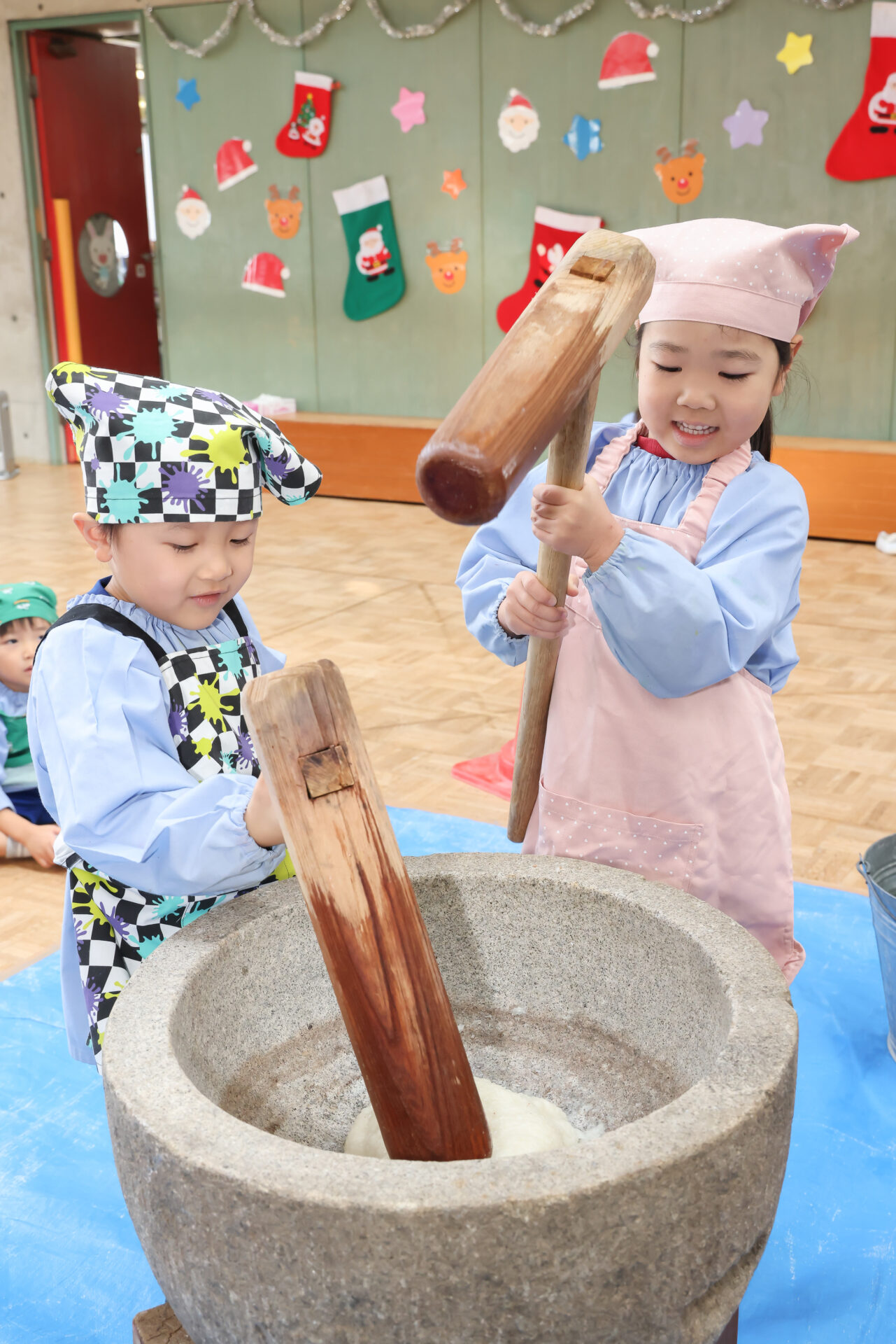 子ども達はエプロンとバンダナを身に着けて準備ばっちり!石臼と杵を使ってお餅つきのスタートです。