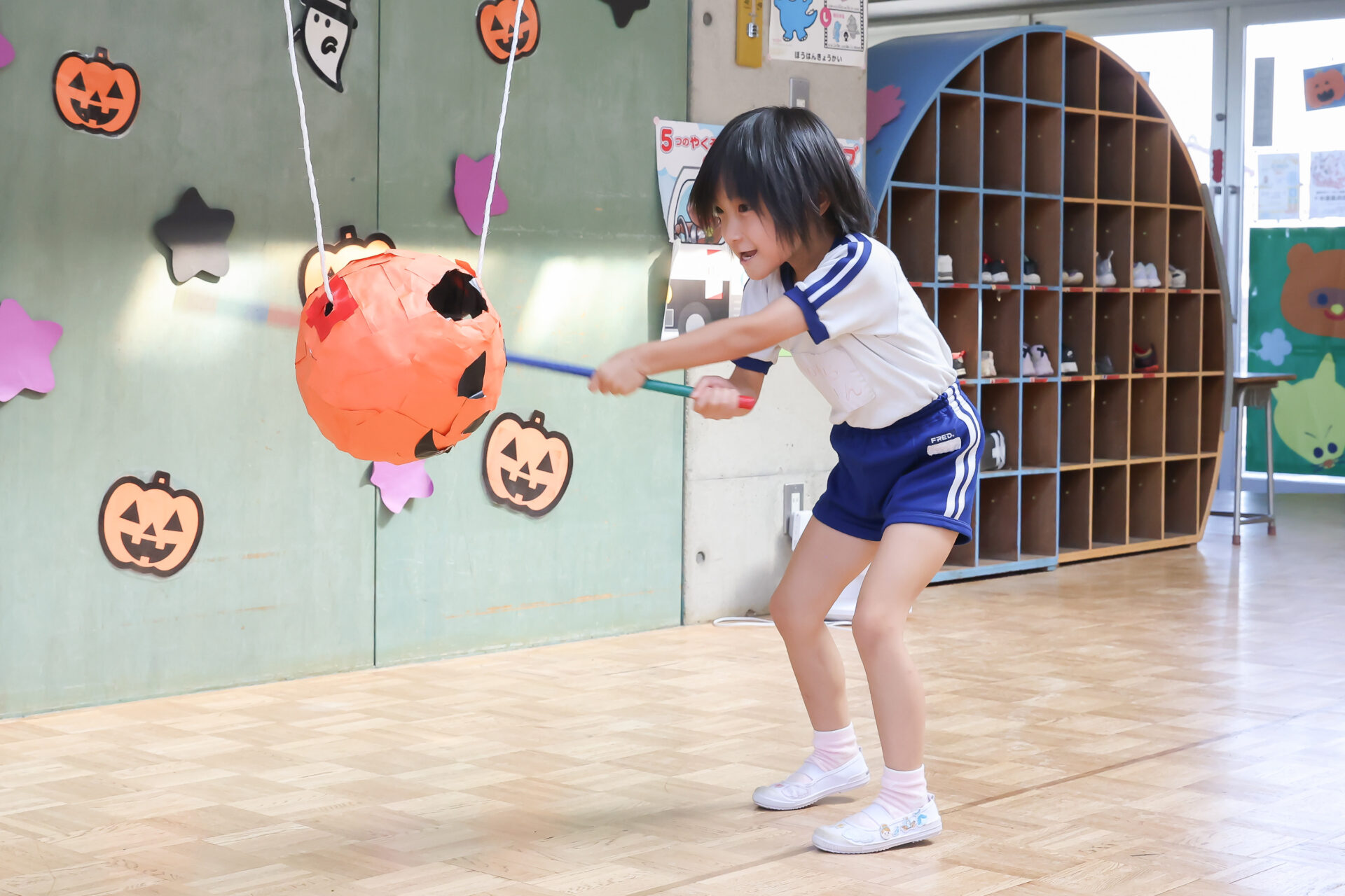 お菓子が入ったピニャータを力いっぱい叩き、みんなで「がんばれ!」と応援しながら、協力して割ることができました。