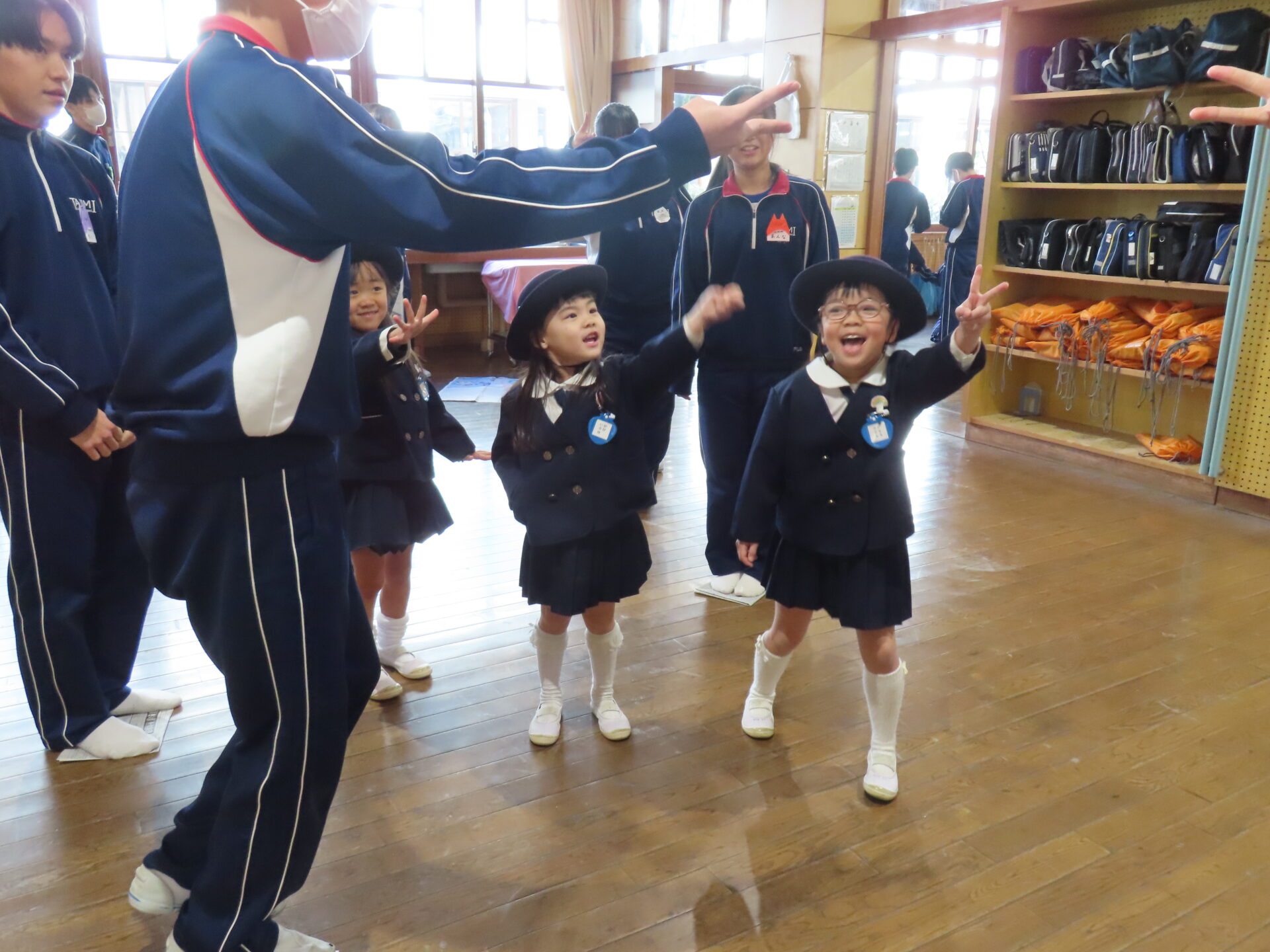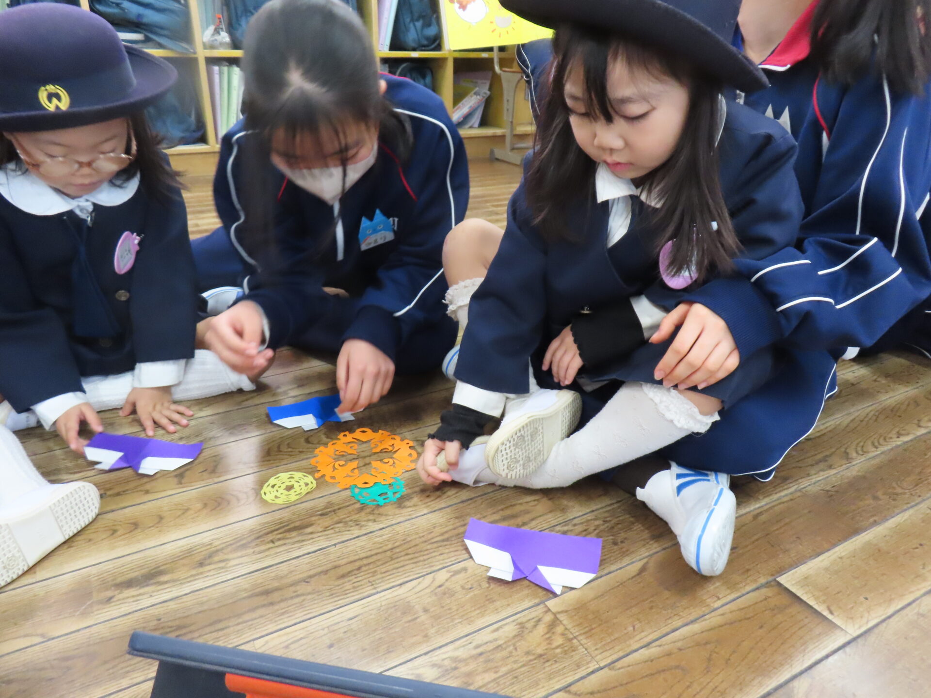 年中さんと年少さんがびっくりしてくれて、年長さんは「大成功!」と大喜びでした。年中さんが手を繋いでくれたおかげで、年少さんも最後までまわる事ができました。