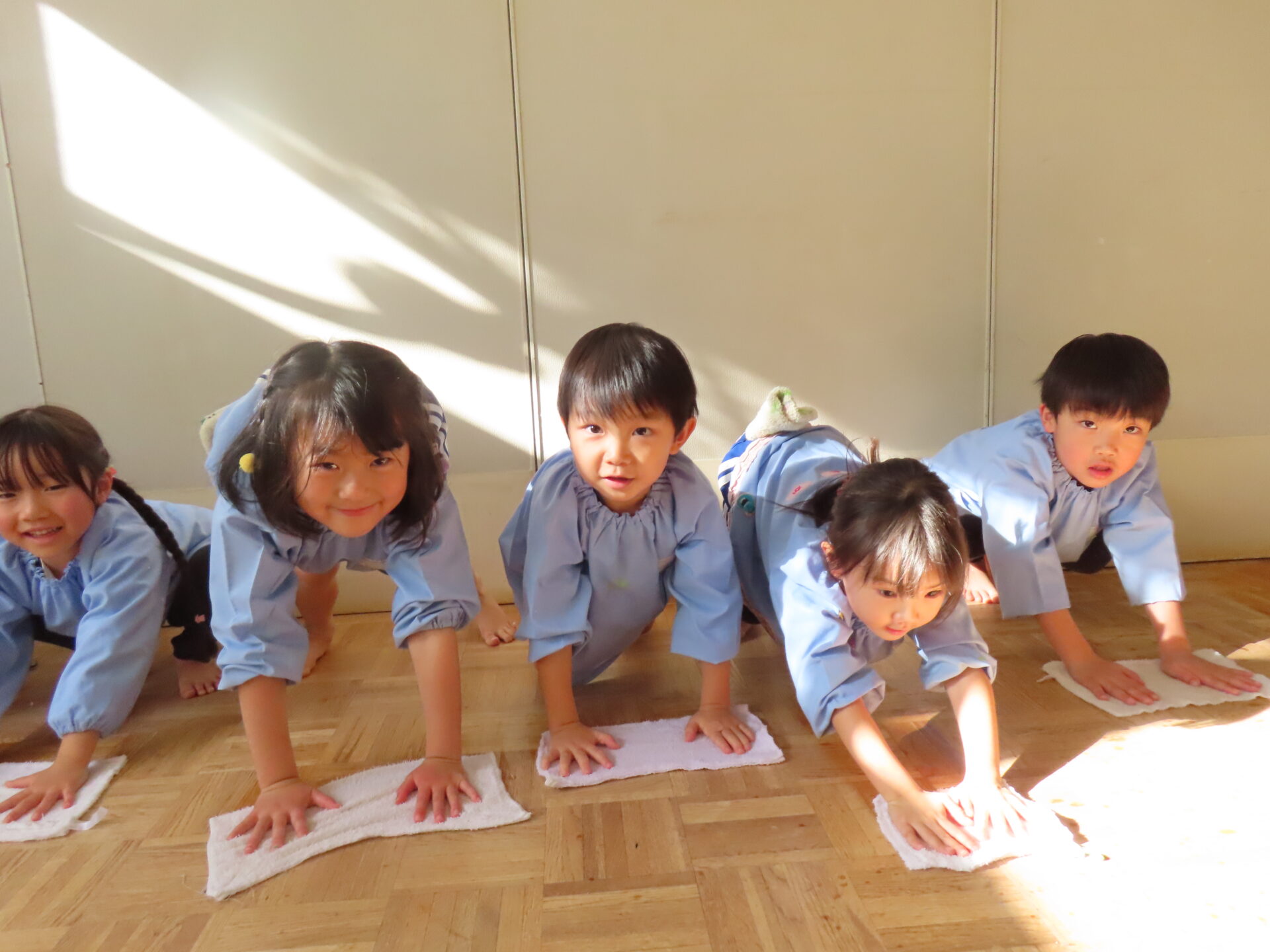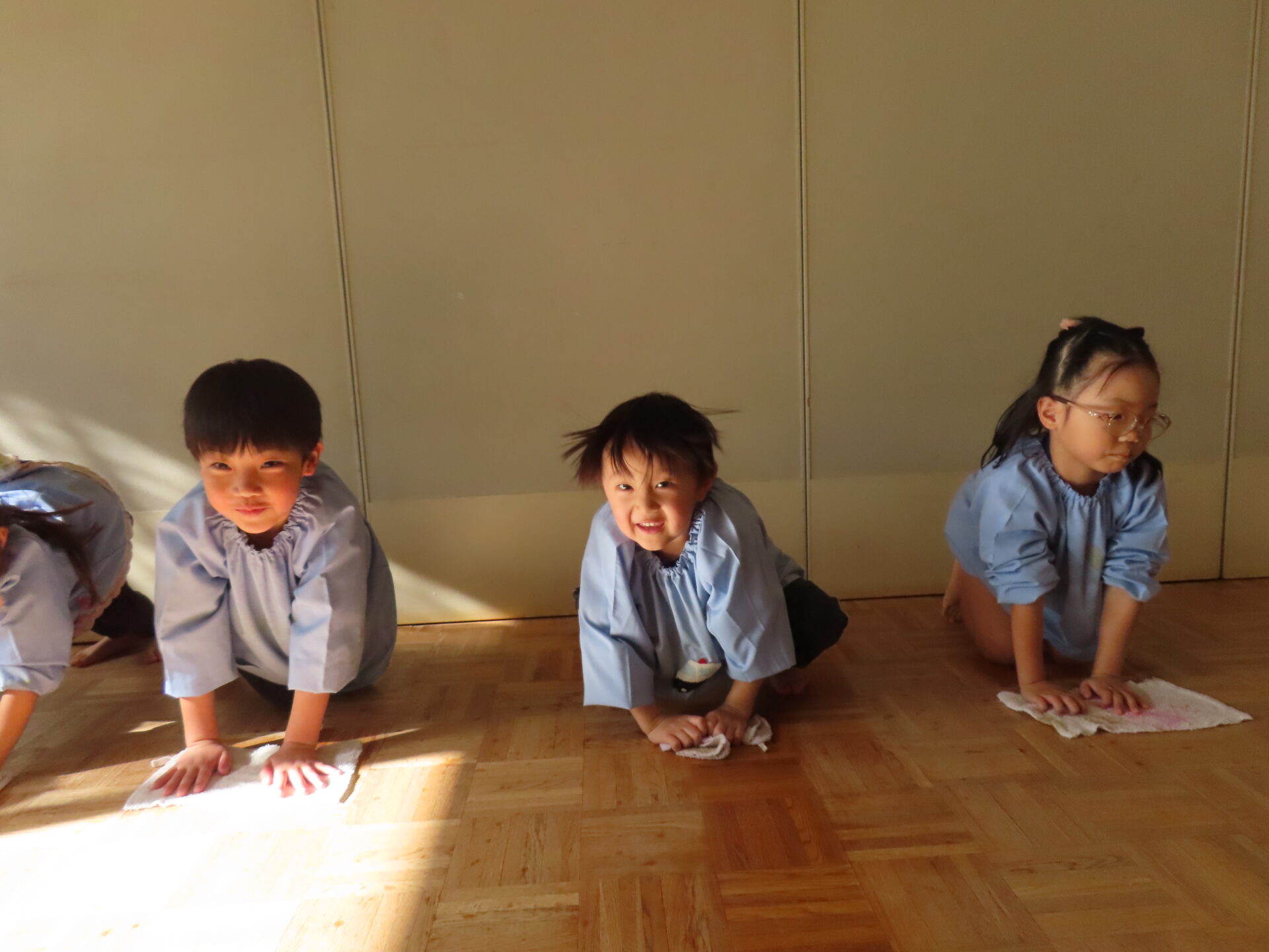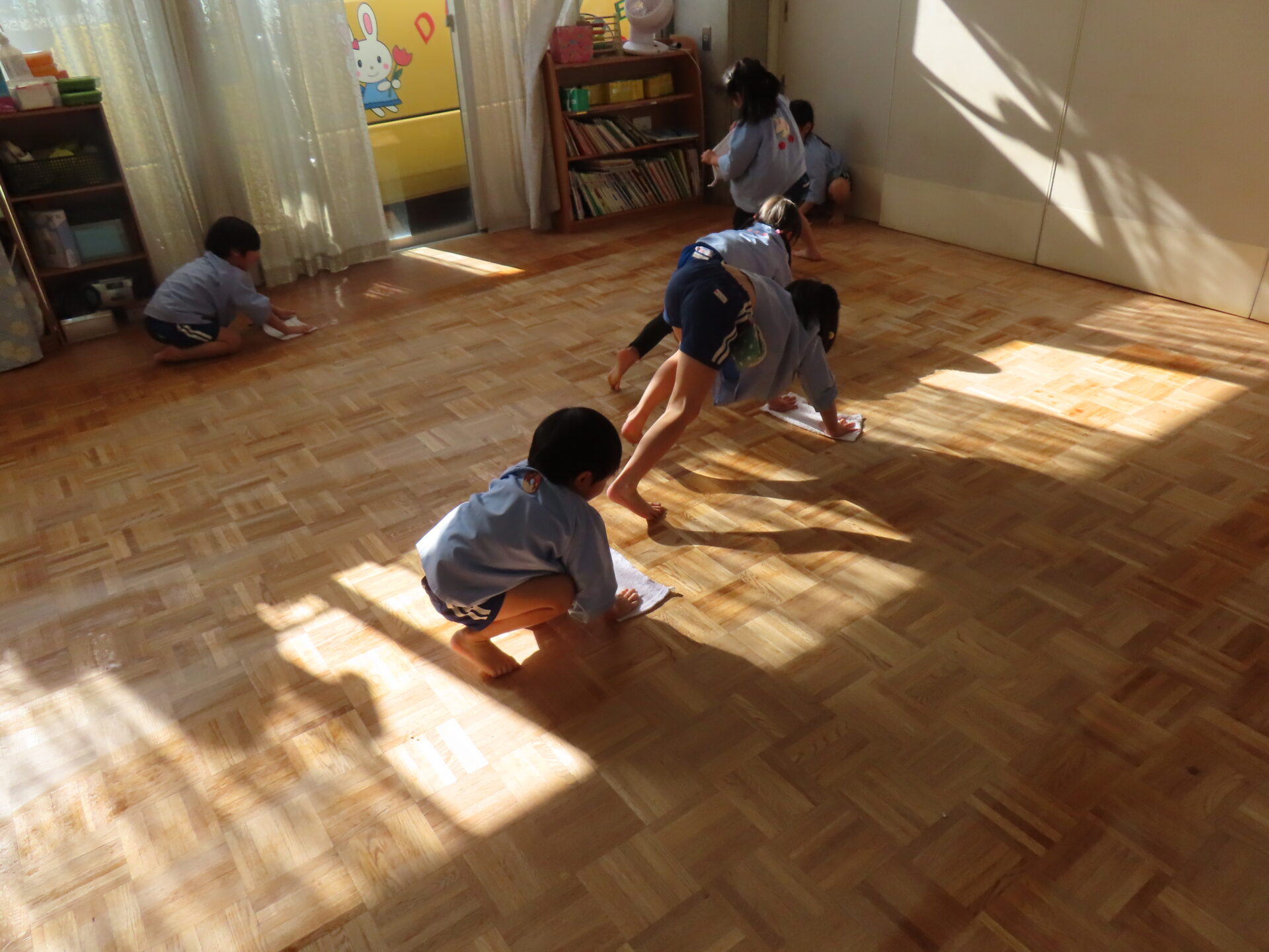 「よーい、どん!」床拭きレースのスタートです。「がんばれー!」「あとちょっと!」「やったー!」と毎回大盛り上がりです。