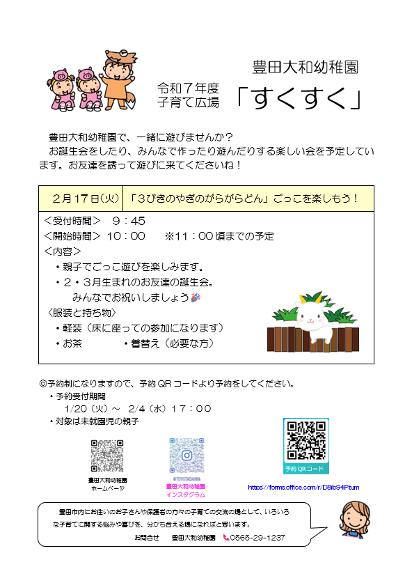 今年度も未就園児を対象におやこでいっしょにあそぼう!「すくすく」を開催します。お友達を誘ってぜひ遊びにきてくださいね。
